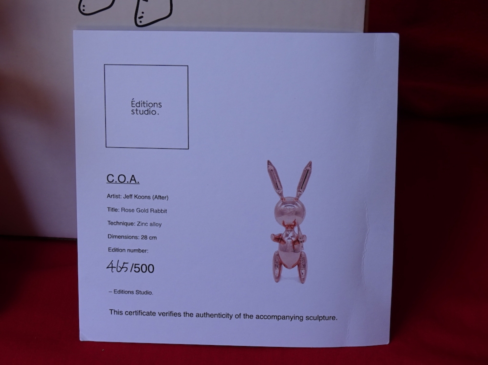 Jeff Koons (after)"Rabbit" Limited edition Zinc alloy 28 cm. About 2 kg. Edition of 500 Studio Editions, complete with original box and original protective packaging. Numbered with certificate. COA Take home this beautiful sculpture by Jeff Koons! Add to your collection with a pice by the undisputed master of neo pop art! Jeffrey Koons, simply known as Jeff Koons, is an American artist considered an icon of the neo-pop style. Jeff Koons Artist is known for his works in kitsch style that ironically illustrate the American way of life and its tendency to consumerism. Today Jeff Koons is considered one of the richest artists in the world and an icon of neo-pop style. During his career, Koons has produced artworks using a vast range of techniques - such as sculpture, painting, installations and photo - and the most varied materials. The artist is generally defined as heir of Andy Warhol and continuator of the pop art; he is often also associate to Marcel Duchamp, of which Koons reinterprets the technique of the ready-made.