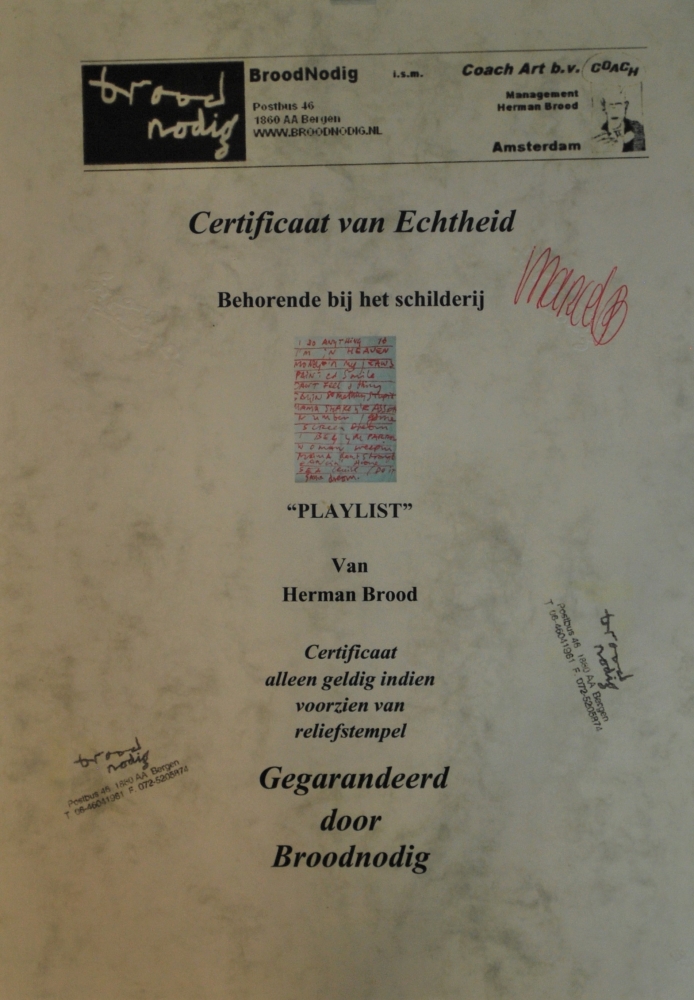 Playlist of setting list van optreden Herman Brood. Dit object van Herman Brood is voorzien van een certificaat van echtheid. Deze is uitgegeven door BroodNodig en Coach Art. Het certificaat is hand gesigneerd door Marcel Brood en voorzien van een reliëfstempel.