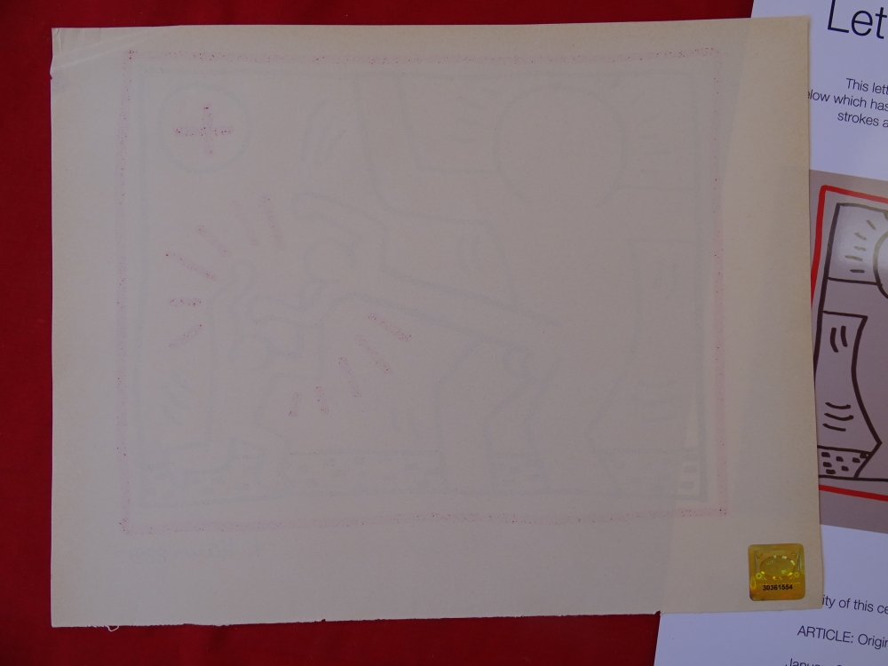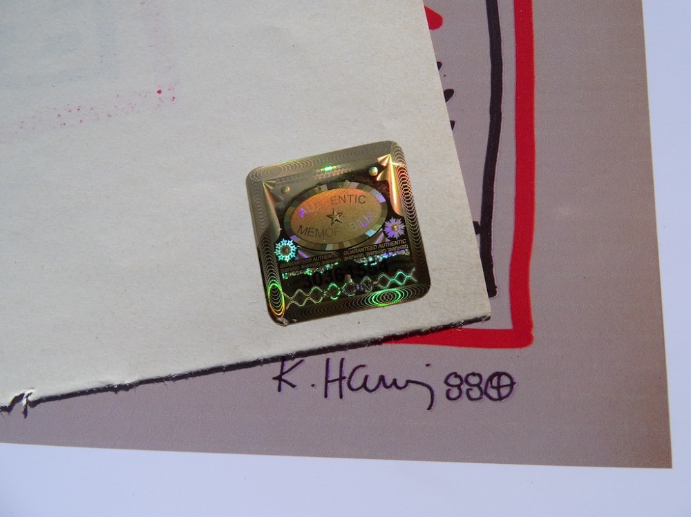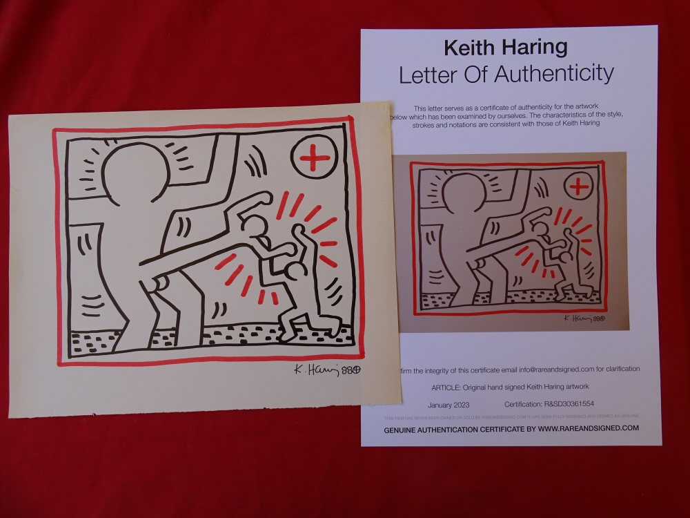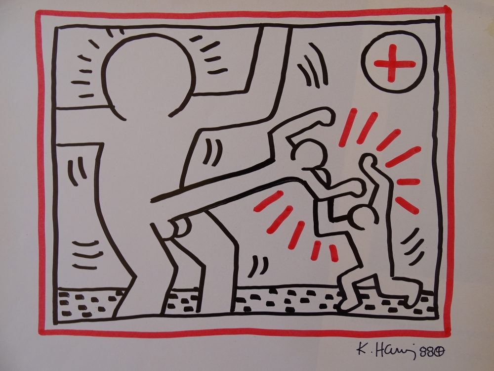 Keith Haring (attributed), ink drawing Keith Allen Haring (May 4, 1958 February 16, 1990) was an American artist whose pop art emerged from the New York City graffiti subculture of the 1980s. His animated imagery has "become a widely recognized visual language".[2] Much of his work includes sexual allusions that turned into social activism by using the images to advocate for safe sex and AIDS awareness. In addition to solo gallery exhibitions, he participated in renowned national and international group shows such as documenta in Kassel, the Whitney Biennial in New York, the São Paulo Biennial, and the Venice Biennale. The Whitney Museum held a retrospective of his art in 1997.