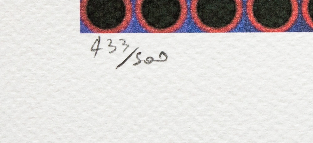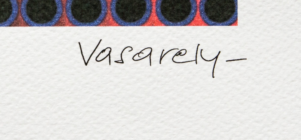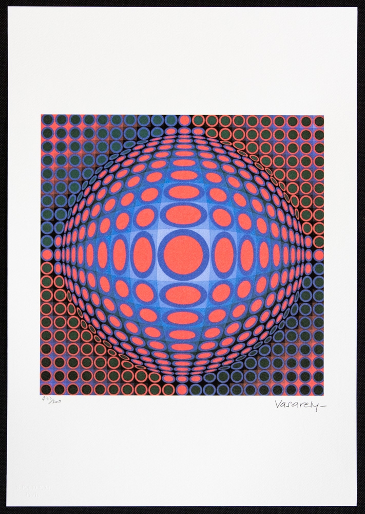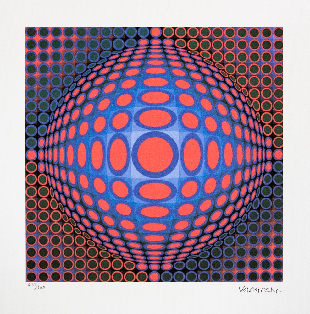 Victor Vasarely (after) "Vega" limited edition of 500, offset lithography, plate signed bottom right, numbered with pencil bottom left 433/500, heavy cotton paper, with embossing stamp "SPADEM, Paris", sheet size 35 x 50cm, without additional documentation, sold unframed; we offer in-house shipping, if the buyer win multiple items, we will combine shipping
