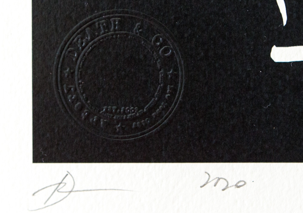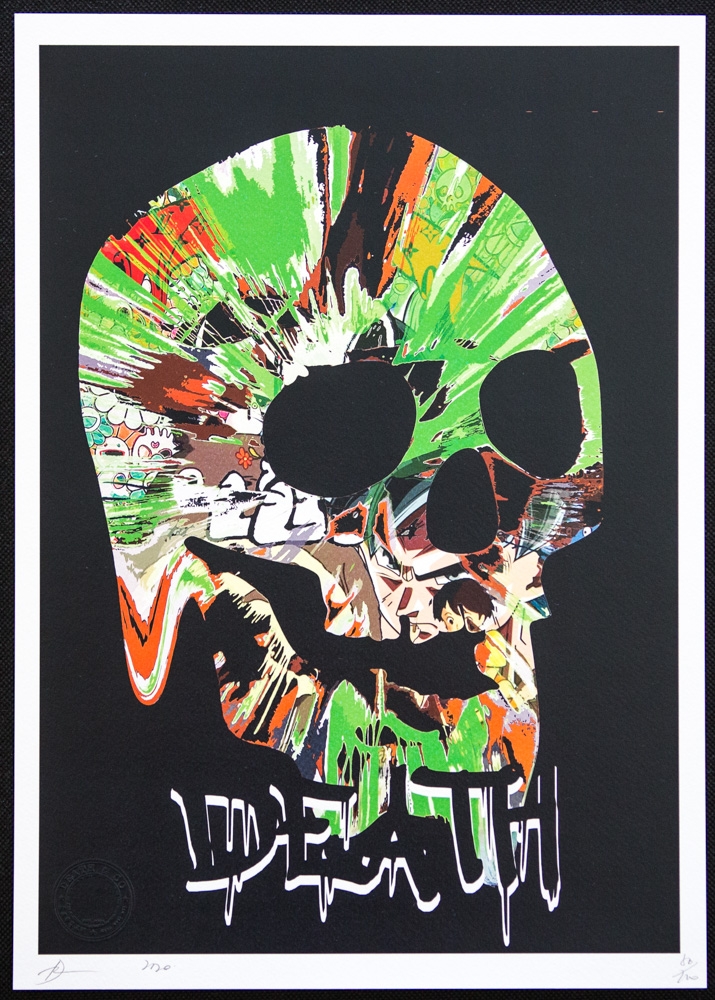 DEATH NYC "Skull - Damien Hirst" DEATH NYC is a New York City-based street artist. Her pseudonym is an acronym for "Don't Easily Abandon the Hope". Print is blind stamped, comes with Certificate of Authenticity signed DEATH NYC and Gold Seal Sticker, Size: 45 x 32 cm, Hand Signed, Excellent Condition, Sold Unframed, we offer in-house shipping, if the buyer win multiple items, we will combine shipping