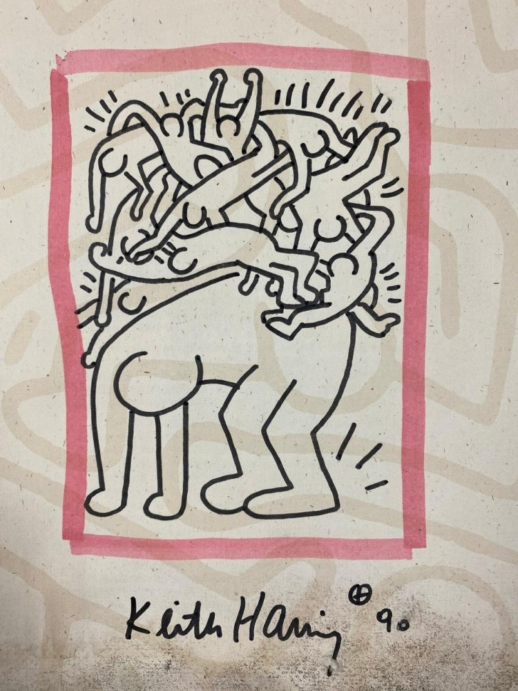 Original drawing by Keith Haring from 1990. Keith Haring made this drawing shortly before his death, the figuration is known from the very last edition that was issued entitled 'Fight Aids Worldwide'. This copy is an original drawing by the artist of this well-known figuration in an old catalogue. The catalog has water damage at the bottom, but the drawing is still completely intact. Collection or shipping possible.