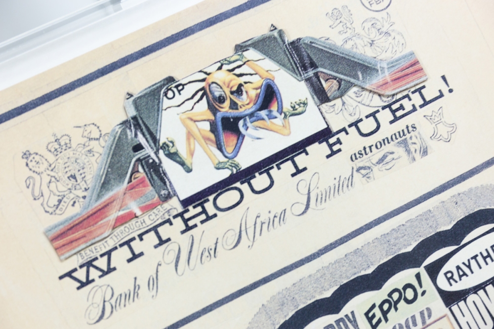 Collage / print from 2003 published by Ronny Van de Velde i.s.m Panamarenko on the occasion of the opening of the Antwerp Luchtschipbouw, his former atelier annex exhibition space. Panamarenko designed dozens of such collages in the 1960s, specifically to publish them in black and white in his pamphlet "Happening News", but these had meanwhile fallen into oblivion.
