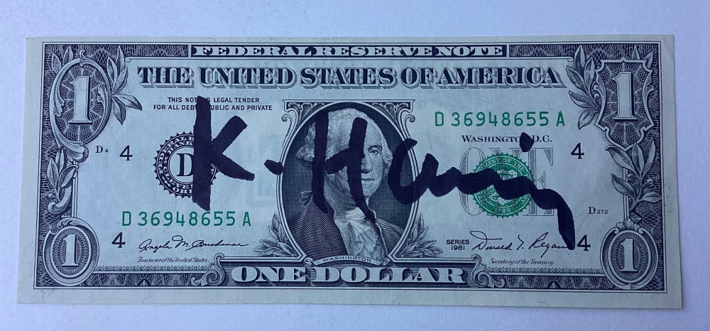 The piece measures approximately 15.7 x 6.5 cm. This is an authentic hand signed animation banknote han signed by Keith Haring (D 1990) Keith Haring was one of the most important street and graffiti artists of the late 20th century. His commitment brought street art to international attention, also thanks to the political and social messages conveyed through his works.