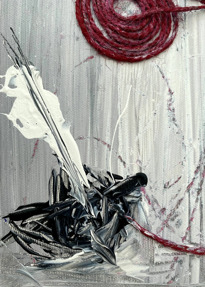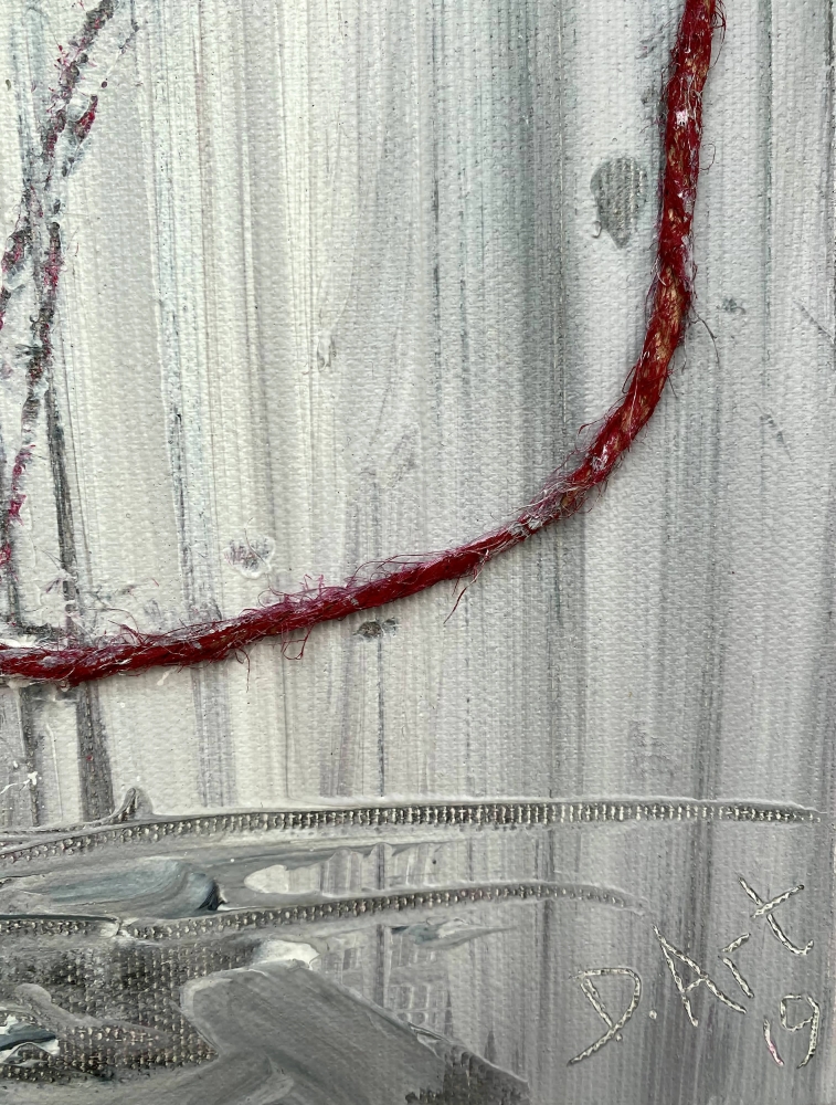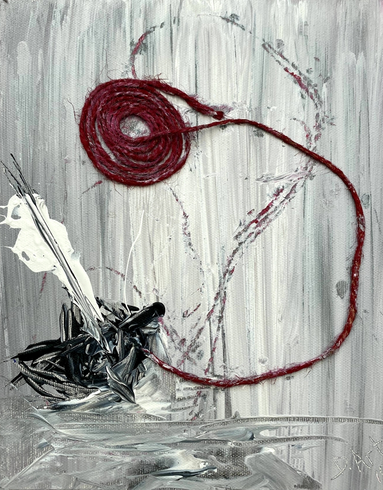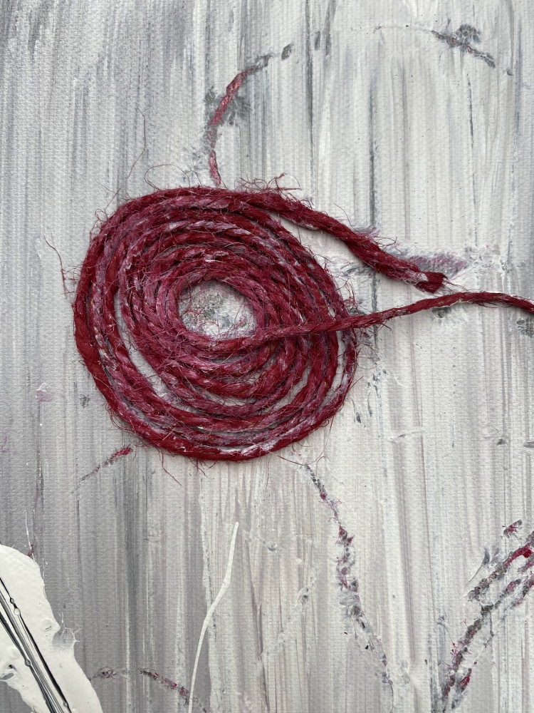 This is acrylic and cord on canvas artwork, finished in 2019. I'm the author of this painting. The painting represents the series 'Dream', where I'm trying to represent emotions through abstract representation. The idea is to give viewers some triggers that would help them to generate their own emotions.
