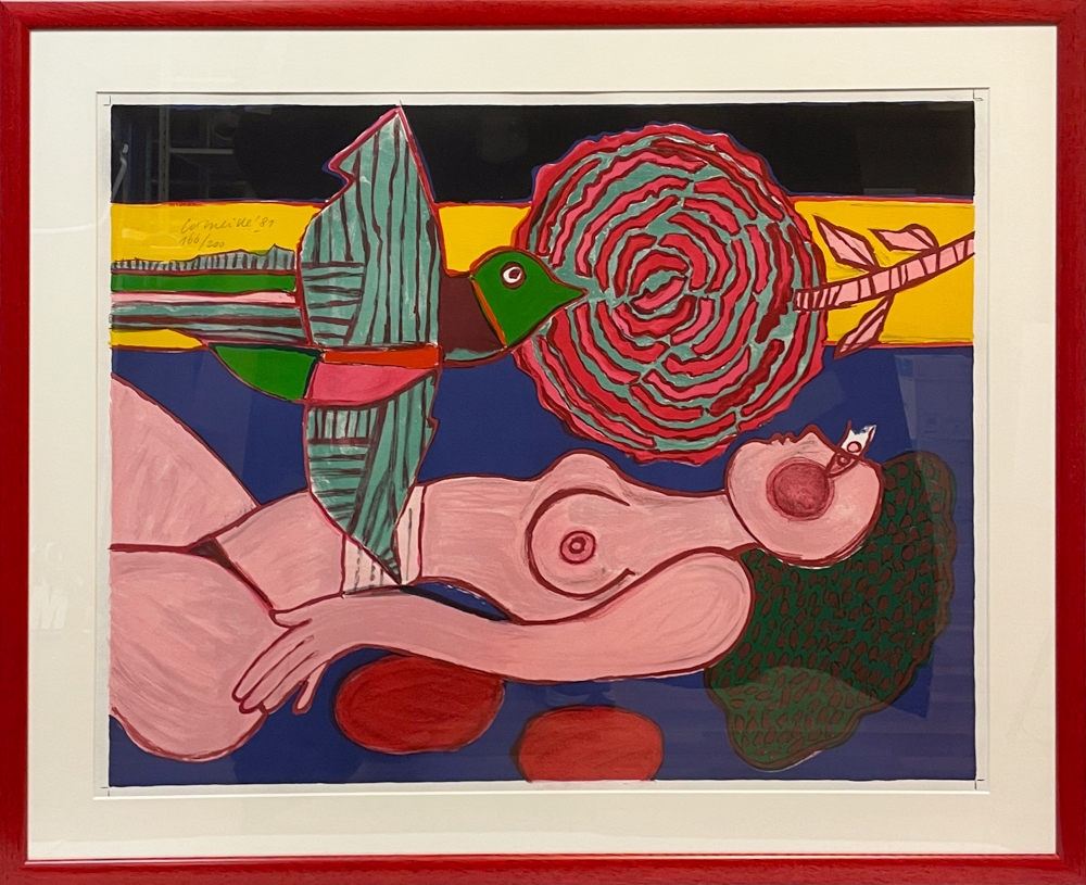 Zeer mooie lithografie van Guillaume Corneille uit het jaar 1987 met een oplage van 200 stuks. Dit is hier nummer 166. Deze lithografie is recent perfect ingekaderd. Werk in zijn typische kleurrijke stijl.