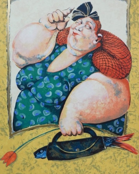 This cheerful lithograph by Ada Breedveld woman with fish Most of the paintings by Ada Breedveld, born in 1944, feature a woman. A voluminous, ever-satisfied smiling woman, surrounded by an ever-changing decor of decorative patterns. The mysterious, introverted smile is the result of self-contemplation and contemplation of the essence of womanhood in all its facets. This is then quickly put into perspective by the humor present. nicely framed without glass