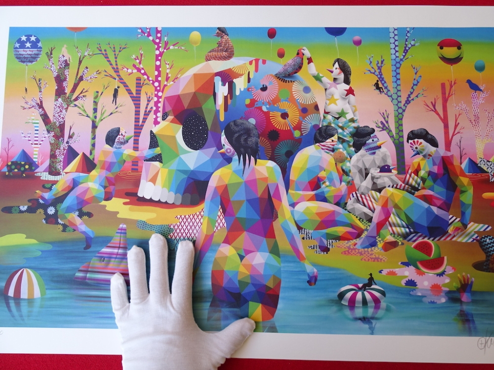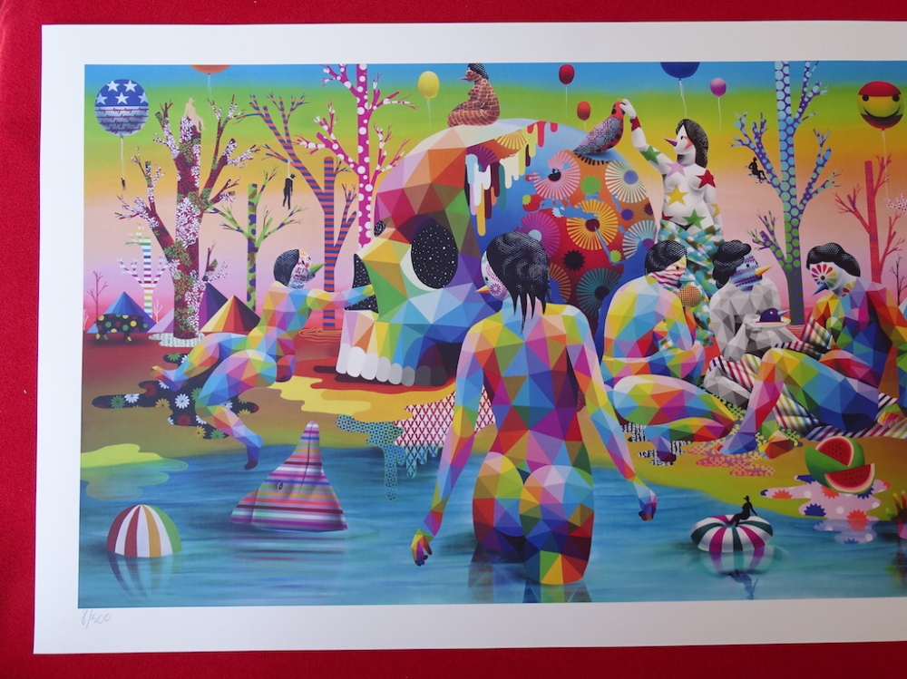 Okuda San Miguel Hand signed and numbered Adaptation of Okuda San Miguels El lago del deseo (Lake of Desire), his first large format work in his career. Frame not included The Spanish artists first interpretation of the Garden of Earthly Delights by Hieronymus Bosch, one of his biggest inspirations. The work has formed part of two of Okudas biggest public exhibitions: his retrospective at Valencias Carmen gallery for the Fallas festival and the Art Madrid fair, both in 2018. Limited edition of 500 copies numbered and hand signed by the artist 70×44 cm Okuda is one of the most important pop art artists of the 20th century in the new pop culture, such as Andy Warhol, Keith Haring, KAWS, Roy Lichtenstein, Banksy, Damien Hirst, Invader, or Jean-Michel Basquiat.