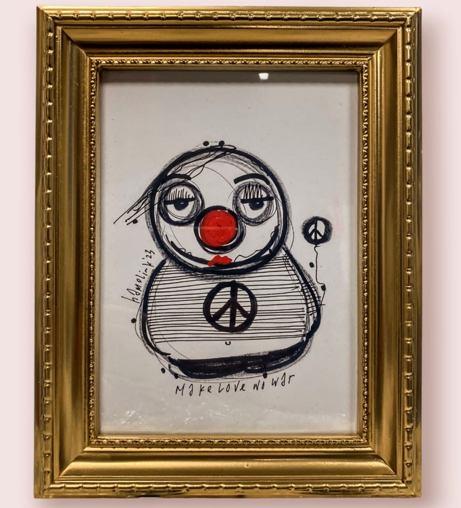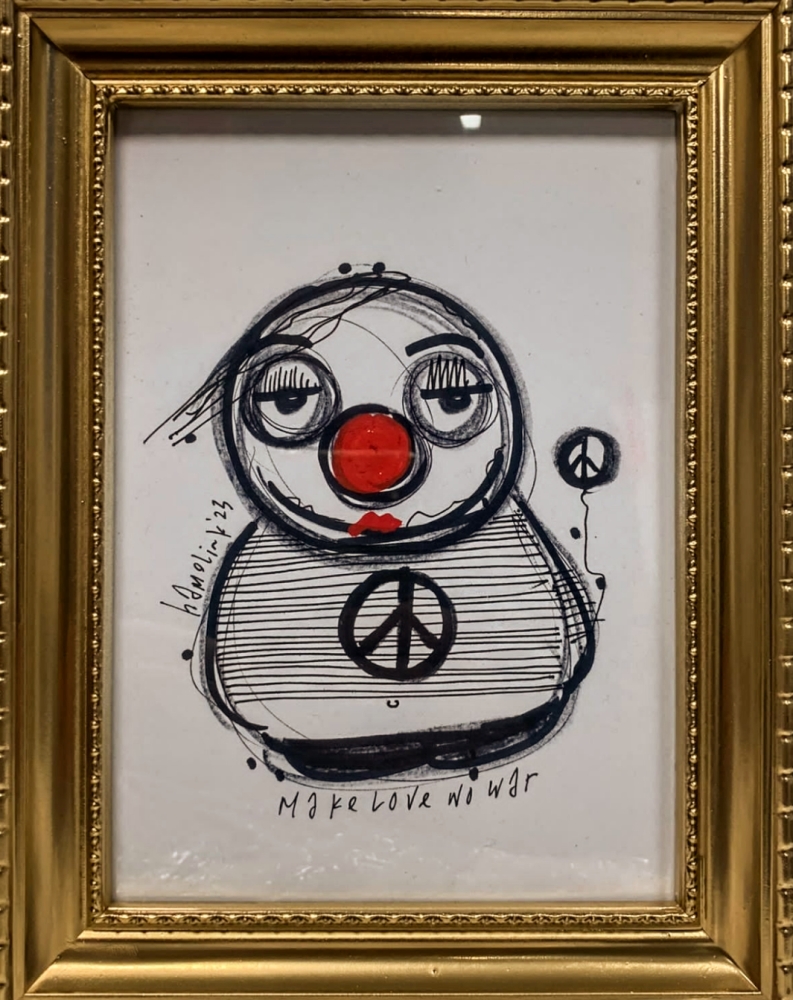 Nice original illustration drawing by the Dutch artist Hamelink. Based on the peace sign with the text below: make love no war. Made on paper with marker, ink and acrylic markers.