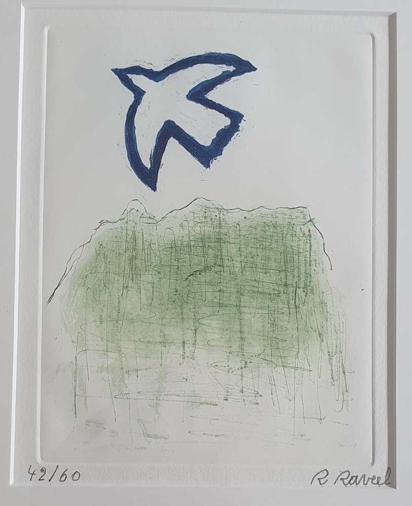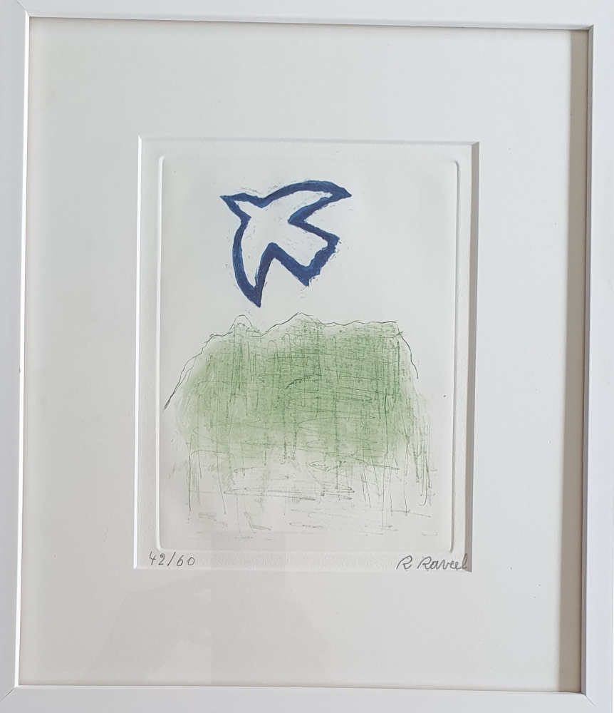 Zeer mooie kleurrijke ets van Roger Raveel. Het werk is afkomstig uit de bibliofiele uitgave 'Het niets, het licht en de dingen' uit 1991. Het werk is gesigneerd en genummerd 42/60. Het werk is mooi ingelijst met dubbele passe-partout.