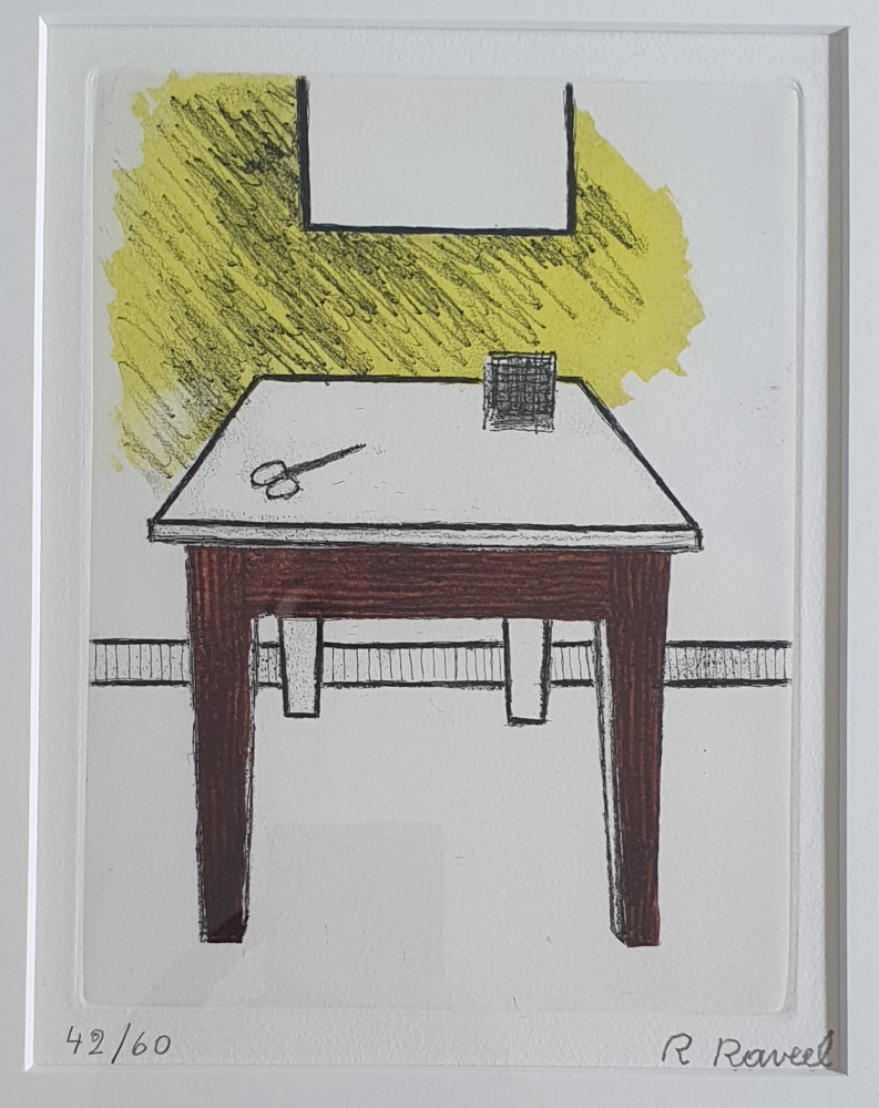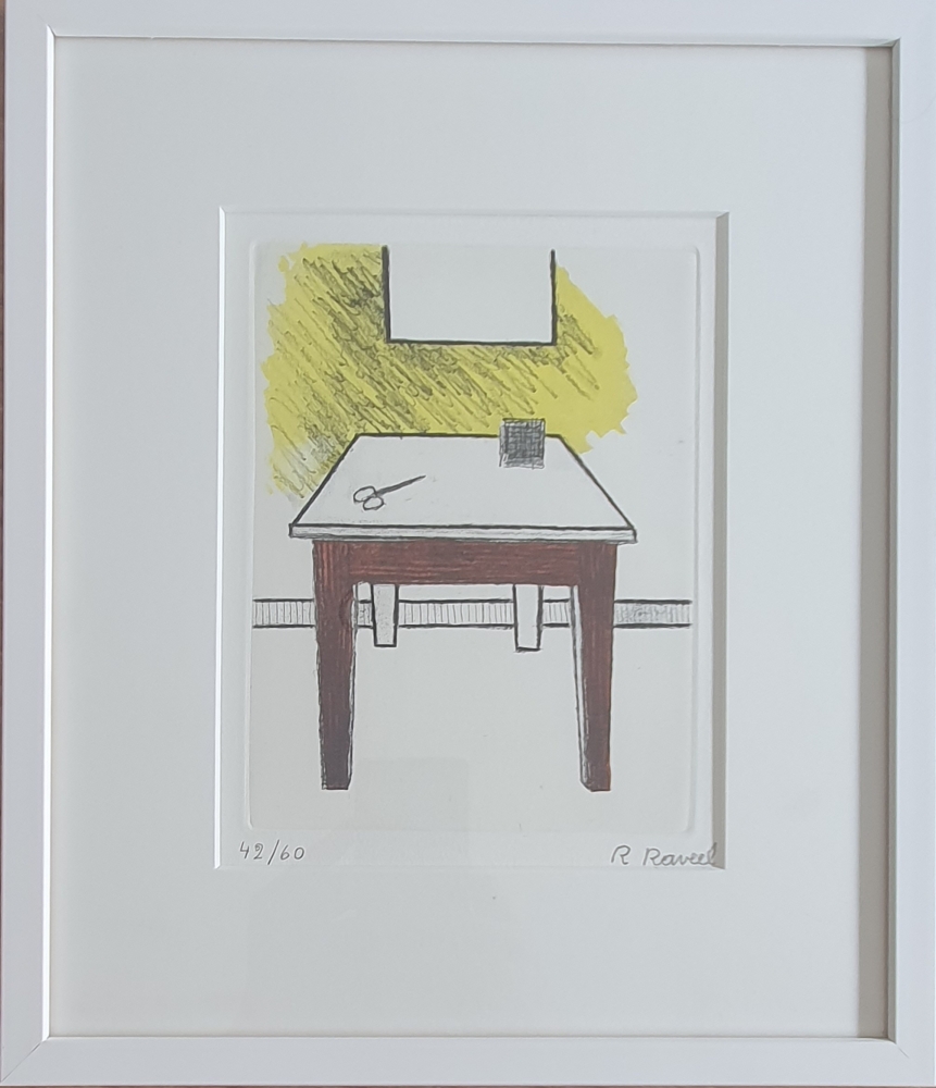 Zeer mooie kleurrijke ets van Roger Raveel. Het werk is afkomstig uit de bibliofiele uitgave 'Het niets, het licht en de dingen' uit 1991. Het werk is gesigneerd en genummerd 42/60. Het werk is mooi ingelijst met dubbele passe-partout.
