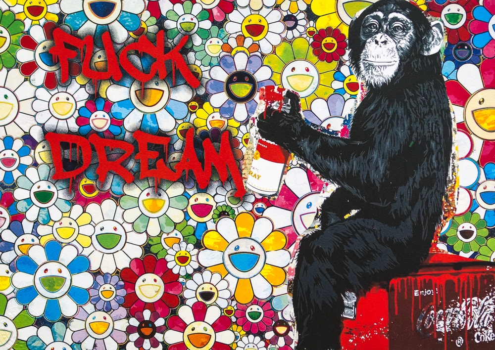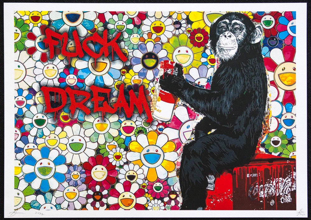 DEATH NYC "Fuck Dream - Banksy & Murakami" DEATH NYC is a New York City-based street artist. Her pseudonym is an acronym for "Don't Easily Abandon the Hope". Print is blind stamped, comes with Certificate of Authenticity signed DEATH NYC and Gold Seal Sticker, Size: 45 x 32 cm, Hand Signed, Excellent Condition, Sold Unframed, we offer in-house shipping, if the buyer win multiple items, we will combine shipping