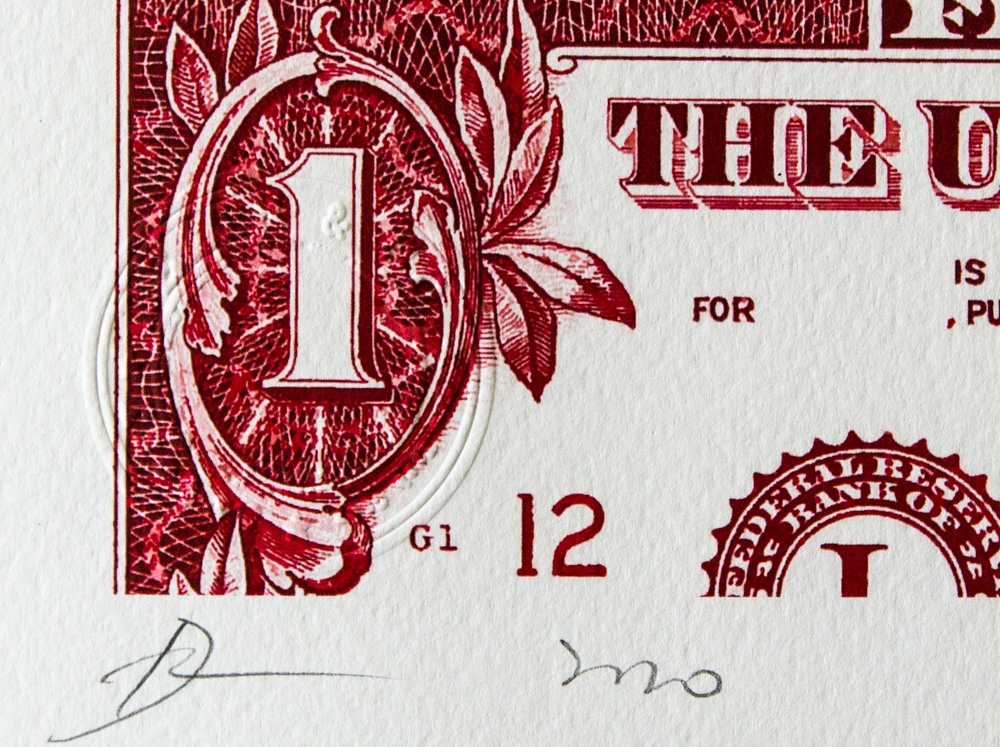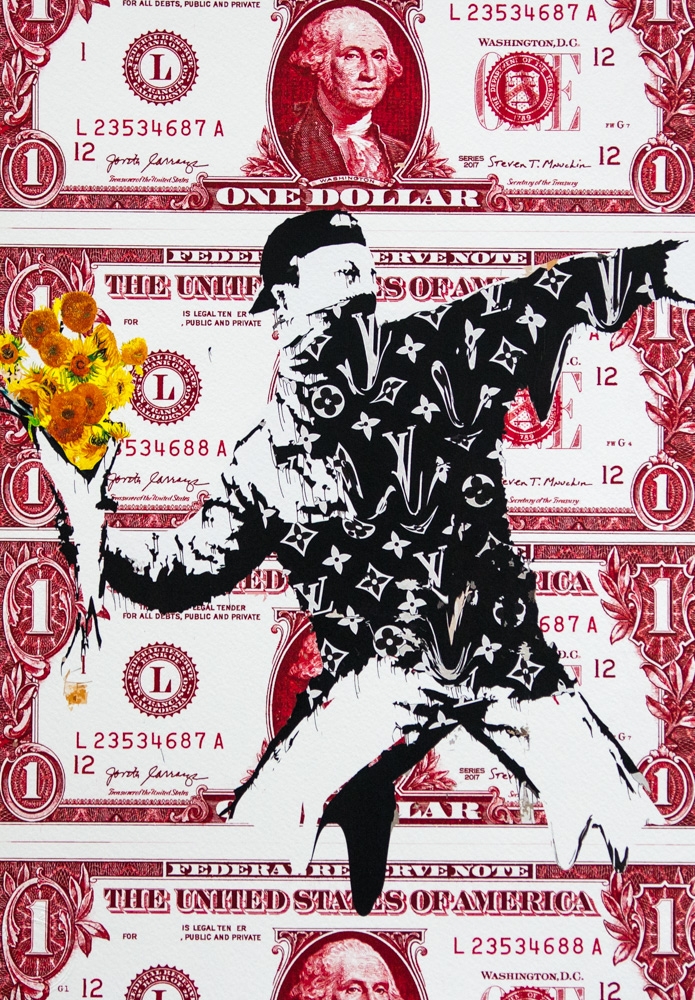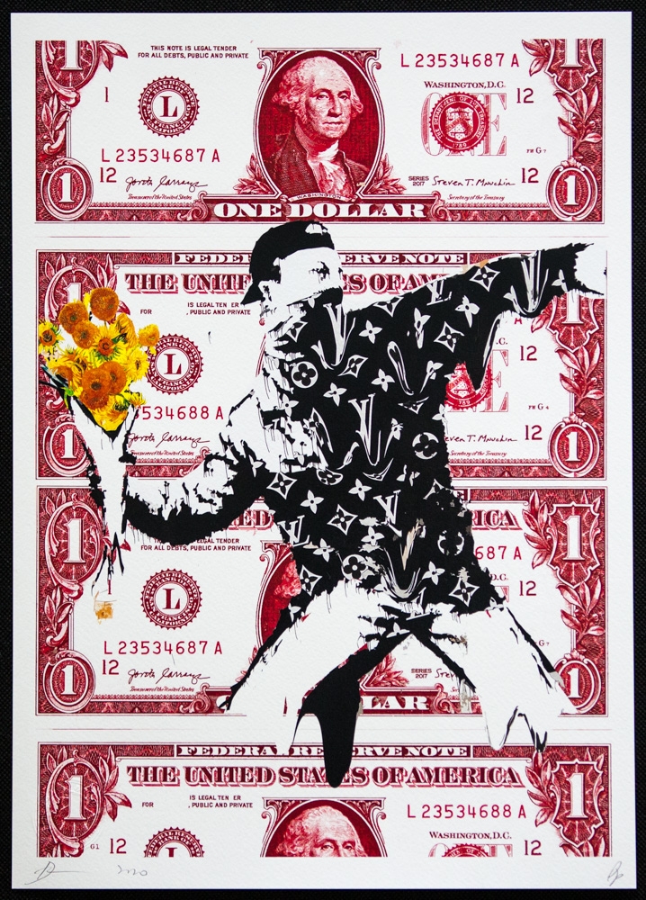 DEATH NYC "Flower Thrower - Banksy & Dollars" DEATH NYC is a New York City-based street artist. Her pseudonym is an acronym for "Don't Easily Abandon the Hope". Print is blind stamped, comes with Certificate of Authenticity signed DEATH NYC and Gold Seal Sticker, Size: 45 x 32 cm, Hand Signed, Excellent Condition, Sold Unframed, we offer in-house shipping, if the buyer win multiple items, we will combine shipping