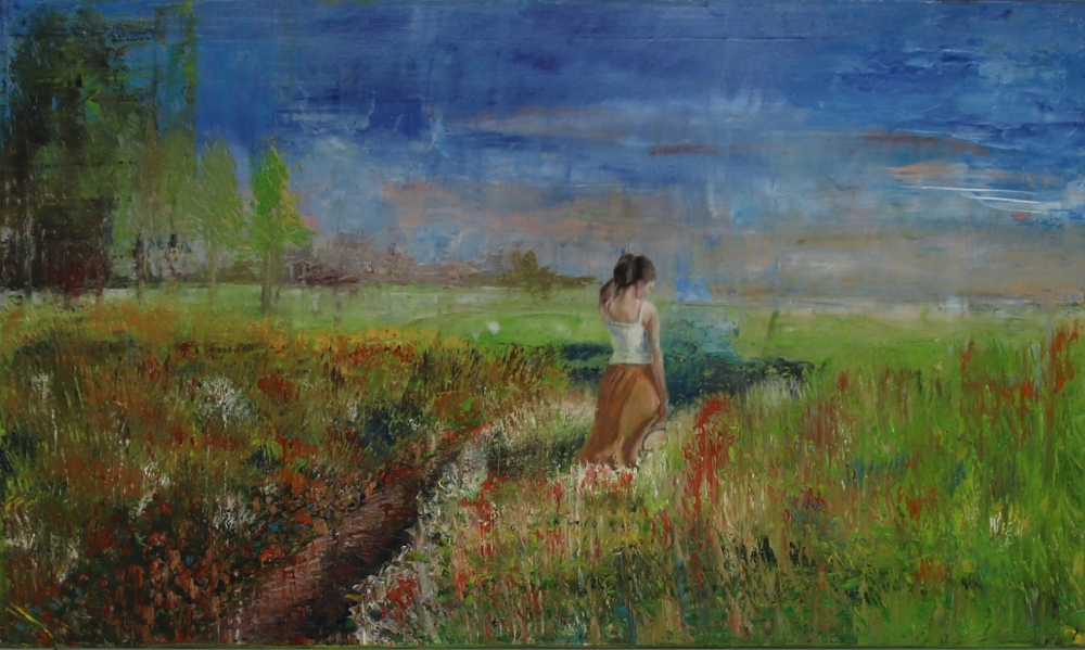 Tuin der vreugde, De blauwe vogel. Olie op canvas. Combinatie van figuratie en kleur abstractie.Gebruikte techniek paletmes in combinatie met penseel. Geïnspireerd op het sprookje 'De blauwe vogel' van Maurice Maeterlinck.