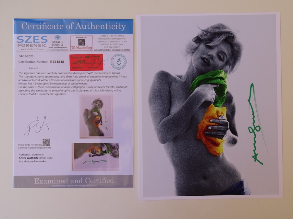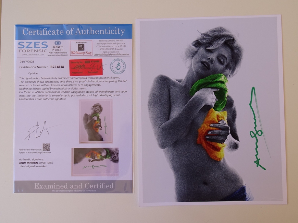 Andy Warhol (1928-1987) - Marilyn Andy Warhol, hand signed, COA included, offset print Warhol has been the subject of numerous retrospective exhibitions, books, and feature and documentary films. The Andy Warhol Museum in his native city of Pittsburgh, which holds an extensive permanent collection of art and archives, is the largest museum in the United States dedicated to a single artist. Warhol has been described as the "bellwether of the art market". Many of his creations are very collectible and highly valuable. His works include some of the most expensive paintings ever sold.[7] In 2013, a 1963 serigraph titled Silver Car Crash (Double Disaster) sold for $105 million. In 2022, Shot Sage Blue Marilyn (1964) sold for $195 million, which is the most expensive work of art sold at auction by an American artist. Contents