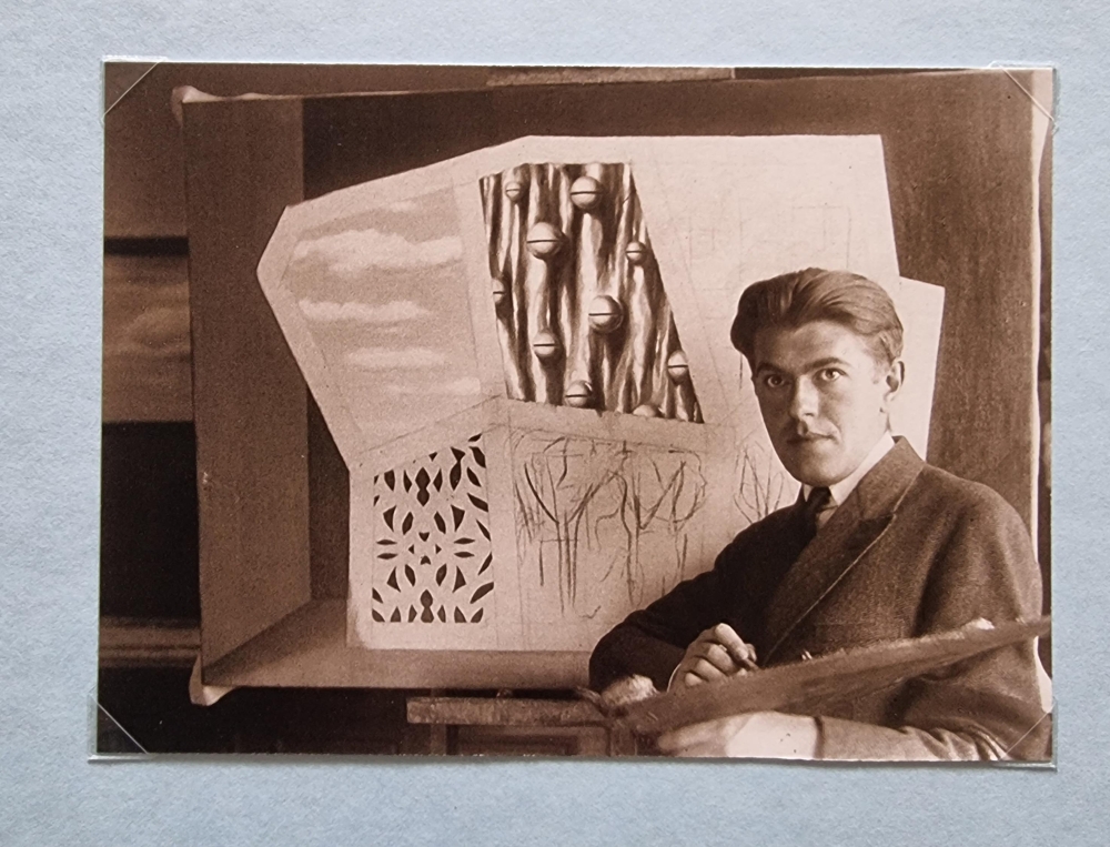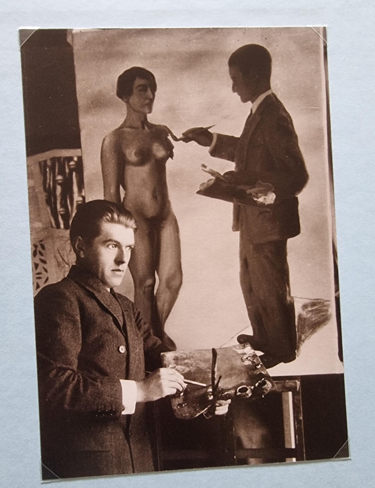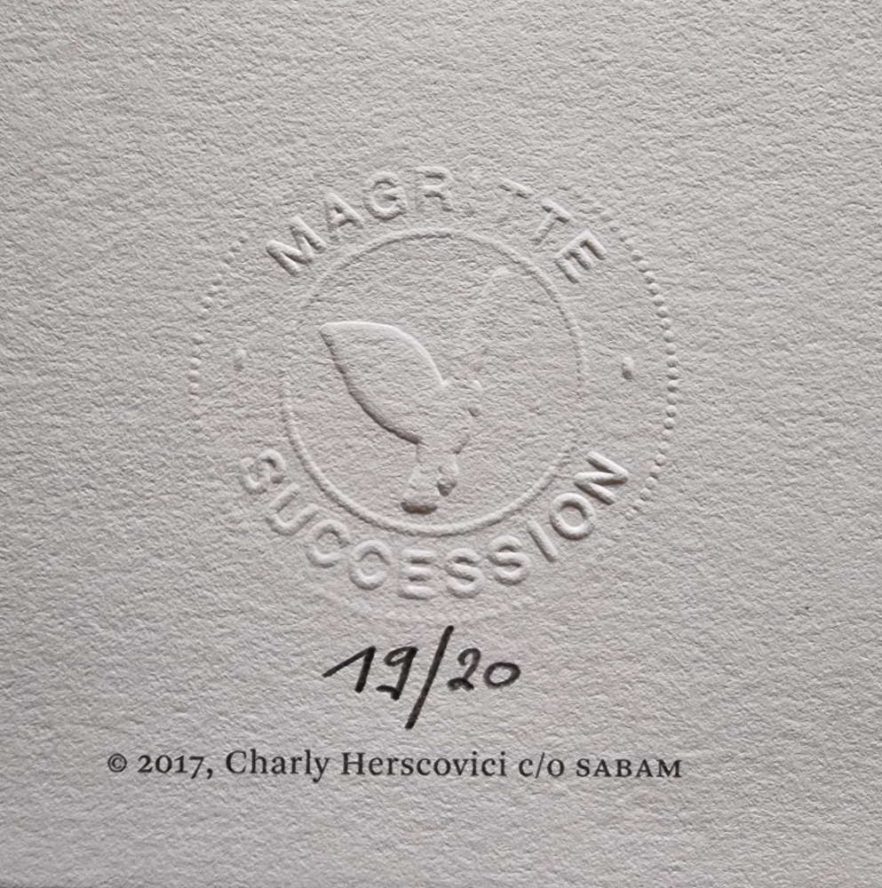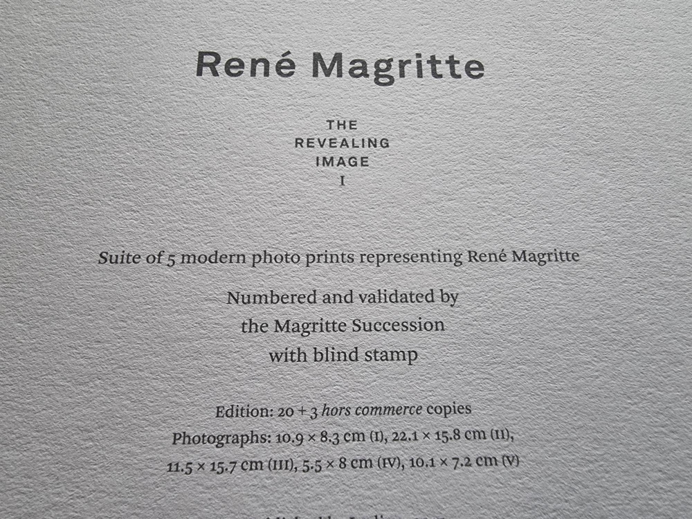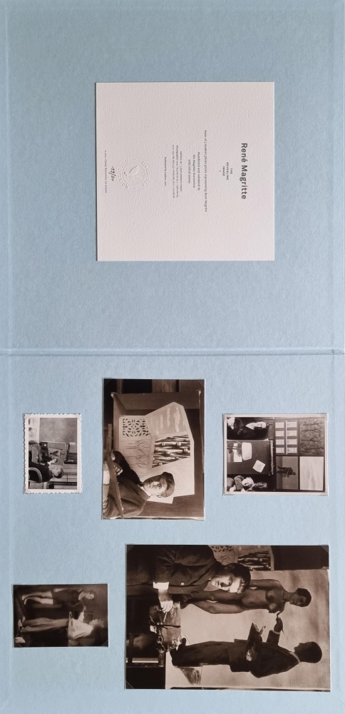 The Revealing Image I RENE MAGRITTE Suite of 5 modern prints based on gelatin prints by René Magritte Numbered and validated with blind stamp by the Succession Magritte Edition of 20 + 3 HC Edition 2017 Five photos, based on original silver gelatin prints, offer us an intimate look at the painter's artistry. We see him in carefully staged scenes for masterpieces such as Le Masque vide, L'Evidence éternelle and La Tentation de l'impossible. In a fourth image he poses for a study that he will later use when painting. In the photo from 1928, which he himself called La Sainte Famille, René looks into the lens with Georgette, amused. He holds a plaster bust in his arms, while Georgette holds their dog Loulou on her lap. They seem to be part of the painting above them on the easel. The photos in this edition are facsimile prints based on silver gelatin prints that were part of the artist's photo archive. Each edition is numbered and validated by the Succession Magritte with a blind stamp
