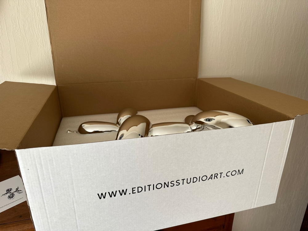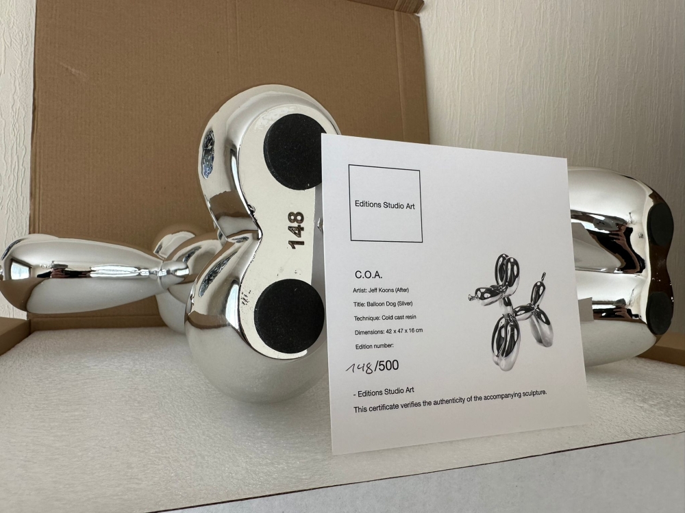 Resin sculpture after Jeff Koons, published by Éditions Studio. Edition limited to 500pieces, of which this number is 148. The sculpture comes with the original packaging and is accompanied by the original certificate. Sculpture is in good to excellent condition.
