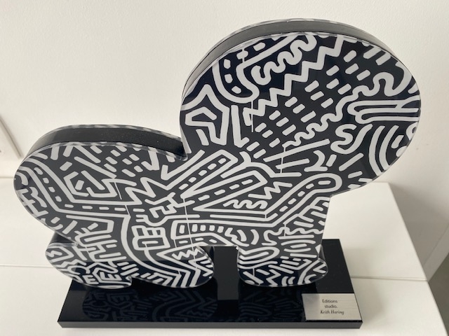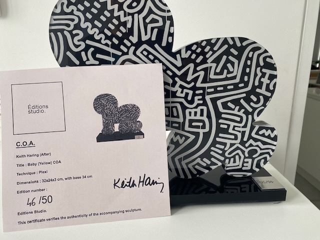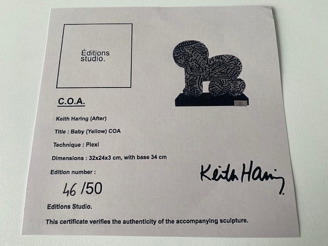 In the 1980s, Keith Haring turned the New York City subway into his art studio, using chalk to etch his now-famous designs wherever he could find space. One of these designs was a crawling child or Radiant Baby, which Haring called the purest and most positive experience of human existence. Haring often used the infant to represent Jesus in nativity scenes or alongside crosses. Over time, the Radiant Baby gained darker significance through Harings depictions of nuclear proliferation, in which the baby appears inside atomic mushroom clouds and scenes of war and violence. While Radiant Baby can be interpreted in several ways, the design was Harings personal favorite among his iconic creations and is now cherished as the artists signature tag. Limited Edition number 46 of 50. Includes a Certificate of Authenticity