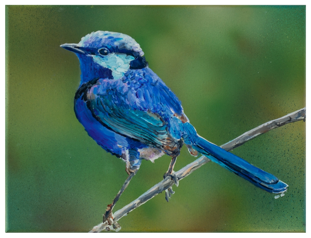 Serie van 5 schilderijtjes over vogeltjes. Het zijn gemengde technieken op linnen. Dit is vogeltje 1 een winterkoninkje die voorkomt in Australië. Het is een acryl achtergrond met airbrush gespoten om een fotografische onscherpte te krijgen. Het vogeltje zelf is in olieverf geschilderd. Hierdoor krijg je een fraai scherp onscherp beeld. Meer werk van Lambert Oostrum is te zien op : www.lambertoostrum.nl. In 1987 heeft Lambert oostrum De Alfons Blomme Prijs in Roeselare gewonnen.Meer info is te vinden op zijn website.