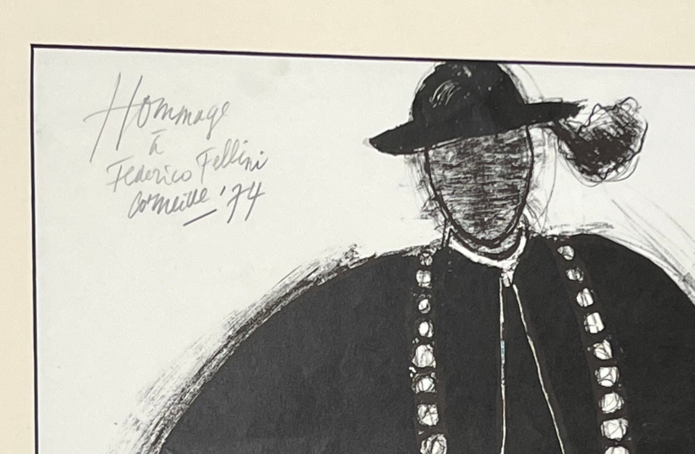 Beautiful framed work with Atelier Corneille stamp on the back. Unique copy (intermediate print) titled, signed and dated in graphite in the upper left corner, delivered with a certificate of authenticity. Trial print from the Atelier Guillaume Corneille. Colour lithograph on Arches, Atelier des presses à bras Michel Cassé, Paris, 68 x 50 cm. 83 x 66 cm with frame. A commercial edition with different colours was printed at 100 copies. The work is listed in the Donkersloot catalogue raisonné under number 361. Guillaume Corneille pays tribute to his friend Federico Fellini with whom he used to go for walks in the suburbs of Rome. Very good condition - Secure shipping with insurance by UPS Exhibition for the 75th anniversary of Cobra from June 1st in the Cobra Museum in Amstelveen. Cobra exhibition with the largest American collection of Cornelius in Miami in spring and summer 2023. The Cobra retrospective in the Cobra Museum in Amstelveen has just ended on 15 January. Release of a Cobra / Corneille stamp by Bpost in 2023 Corneille's jewellery on display at the Boghossian Foundation until 14 May 2023 (Ornamentum, Collection Diane Venet)