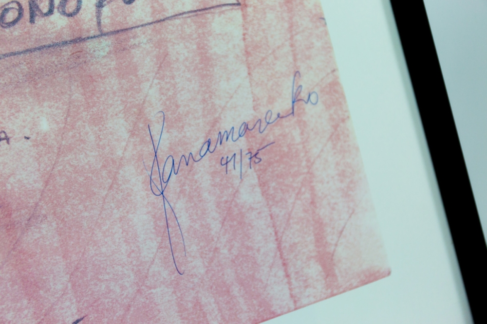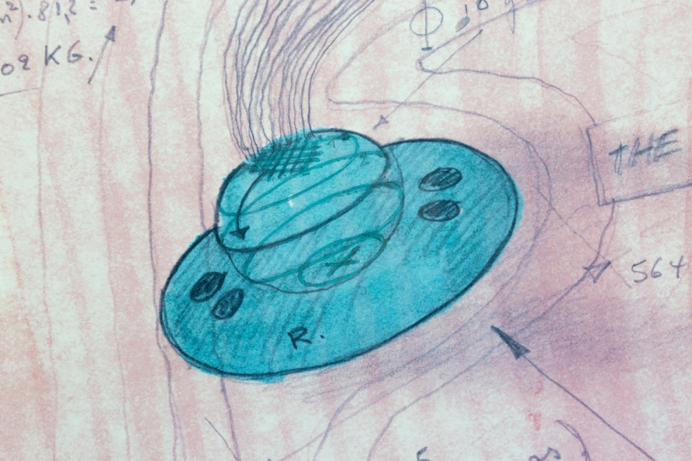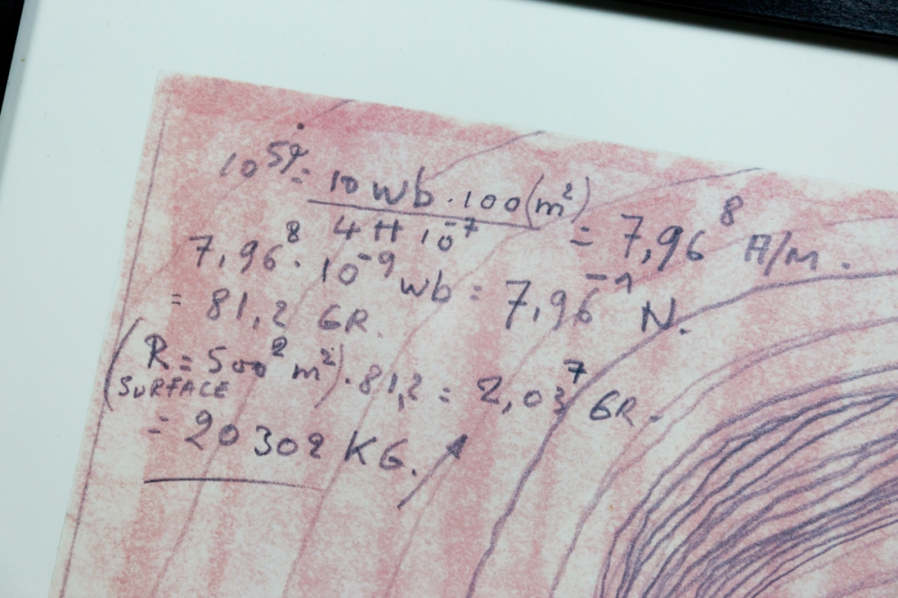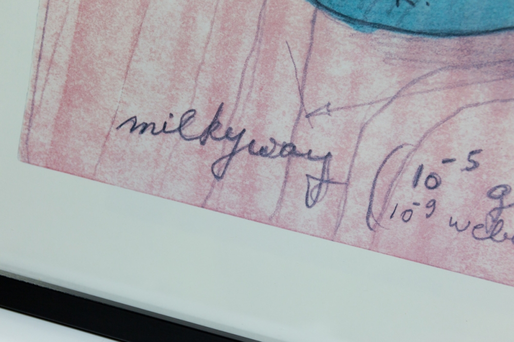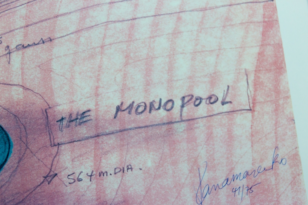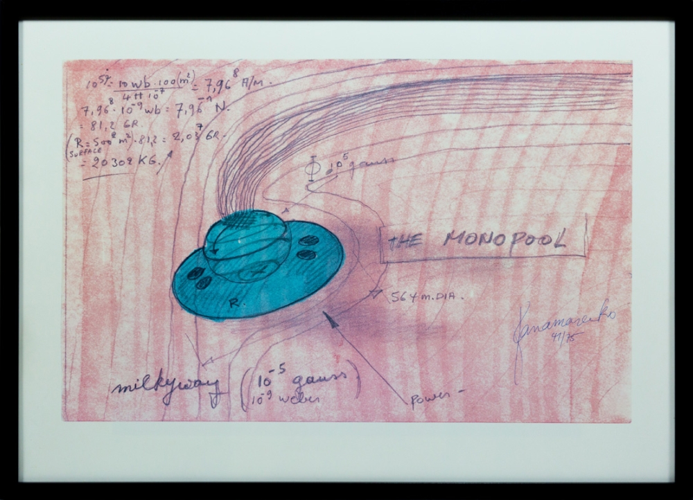 Een hele mooie offsetlithografie uit 2001 van Panamarenko's Monopool op een beperkte oplage van 75 + xx. Gesigneerd en genummerd in blauwe stift. Deze tekening verwijst naar het oude idee van Panamarenko een ruimteschip te maken waarvan één magnetische pool opgesloten kan worden, zodat het schip zich surfend kan voortbewegen op de magnetische velden in de ruimte.