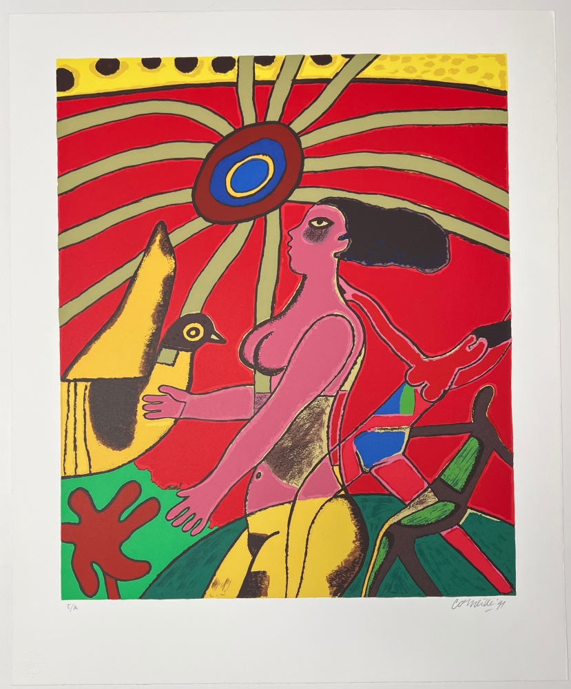 An emblematic work that has been the subject of several major exhibitions, but is now hard to find. A work full of movement, with a nod to Matisse's dancers, in a jovial, colourful world that celebrates harmony with nature. Artist's copy EA, signed and dated in graphite at the bottom. with Atelier Corneille stamp on the back. Very good condition Cobra 75th Anniversary Exhibition from 1st June at the Cobra Museum in Amstelveen. Cobra exhibition of Corneille's largest American collection in Miami in spring and summer 2023. The Corneille retrospective at the Cobra Museum in Amstelveen ended on 15 January. Release of a Cobra / Corneille stamp by Bpost in 2023. Corneille jewellery exhibited at the Boghossian Foundation until 14 May 2023 (Ornamentum, Collection Diane Venet)