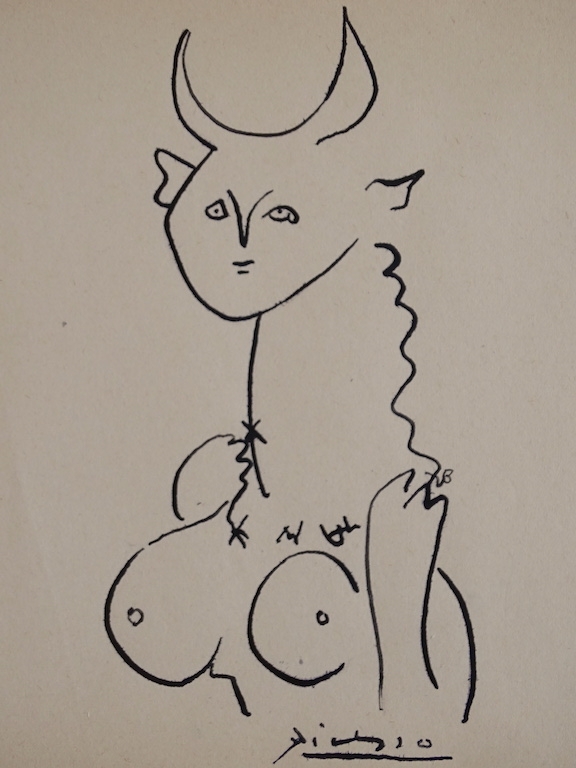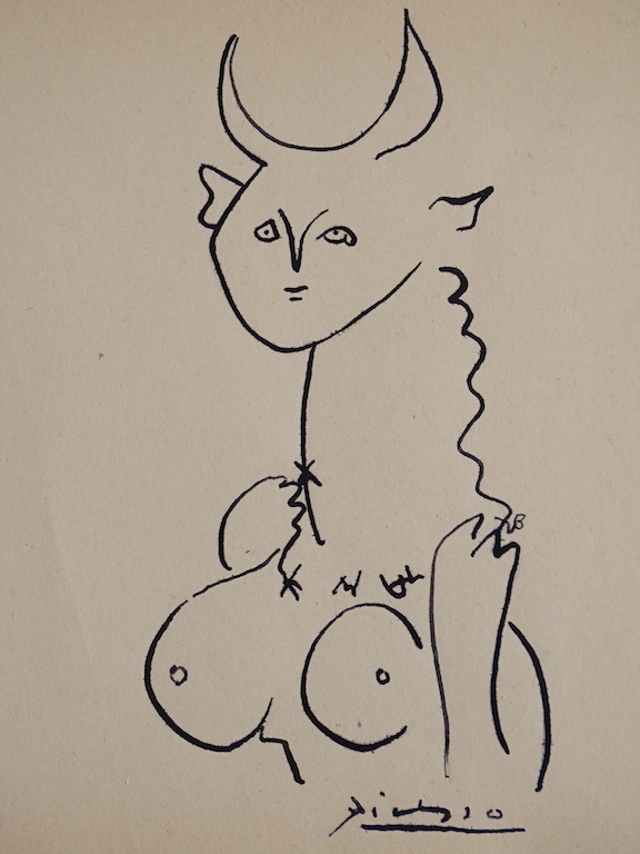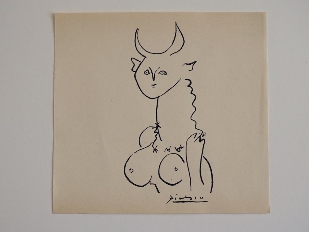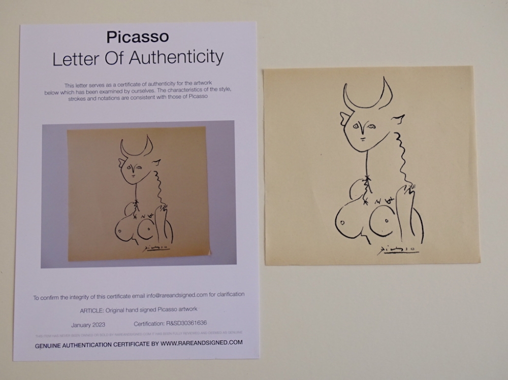 Pablo Picasso (attributed) ink drawing Very good condition Letter of authenticity includedPablo Ruiz Picasso[a][b] (25 October 1881 8 April 1973) was a Spanish painter, sculptor, printmaker, ceramicist and theatre designer who spent most of his adult life in France. Regarded as one of the most influential artists of the 20th century, he is known for co-founding the Cubist movement, the invention of constructed sculpture, the co-invention of collage, and for the wide variety of styles that he helped develop and explore. Among his most famous works are the proto-Cubist Les Demoiselles d'Avignon (1907), and the anti-war painting Guernica (1937), a dramatic portrayal of the bombing of Guernica by German and Italian air forces during the Spanish Civil War.