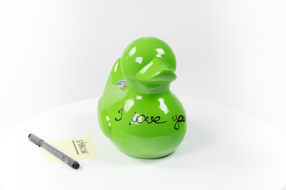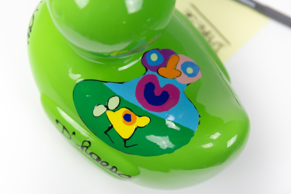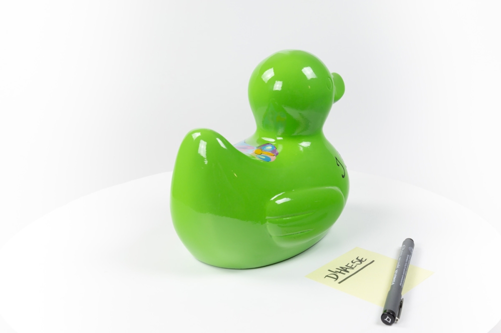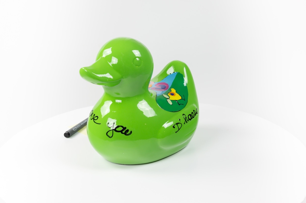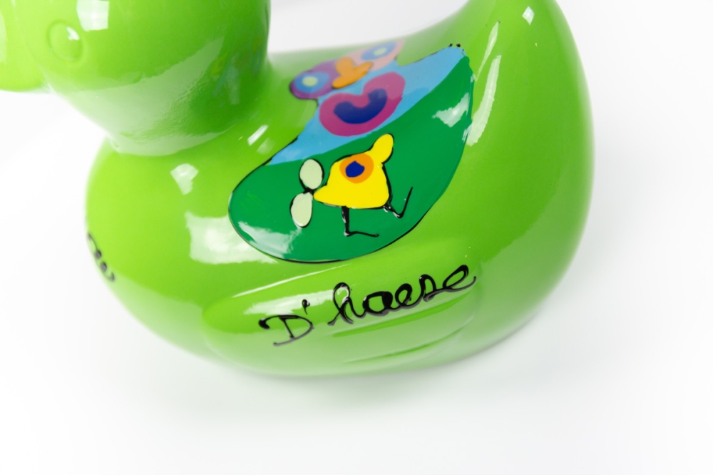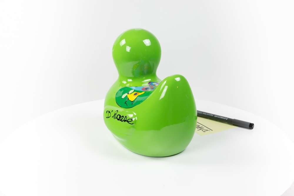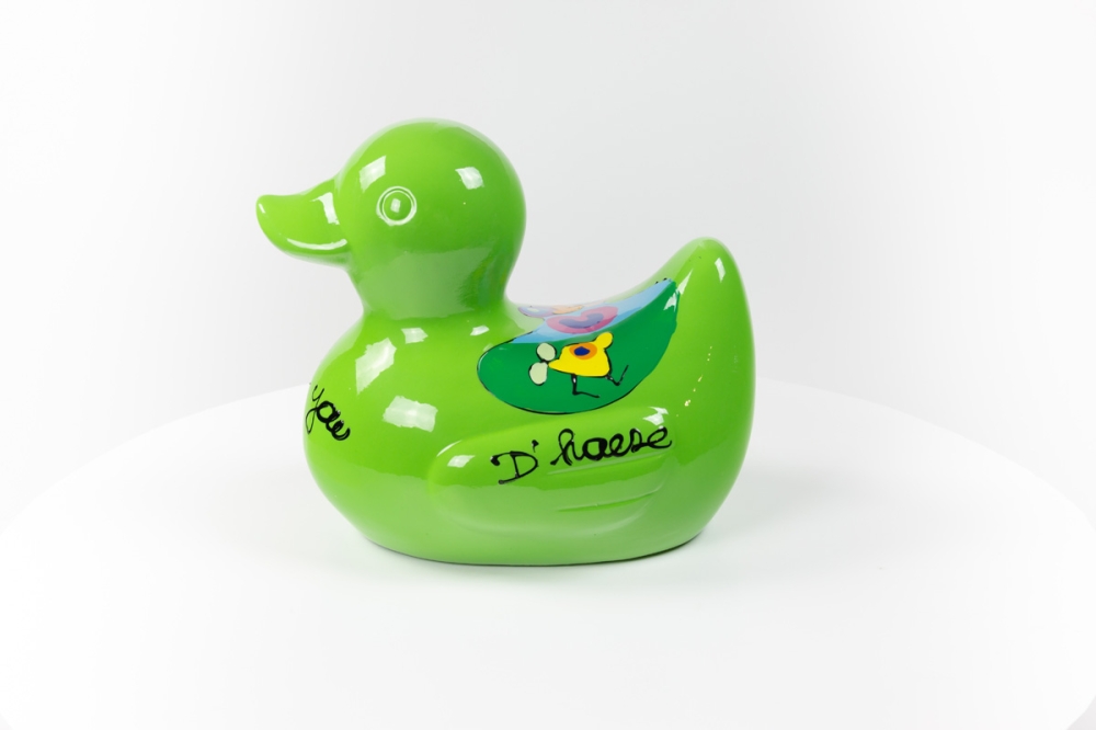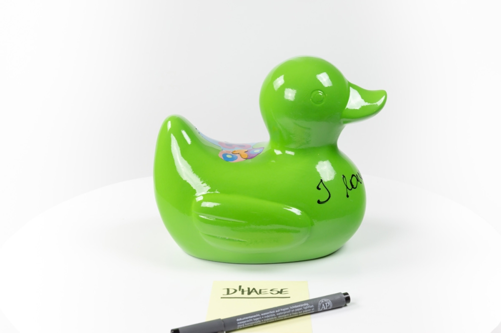 Sculptuur van Hannes D'Haese in de vorm van een eendje. Item werd uniek beschilderd op de rug en met de hand, in verf gesigneerd.