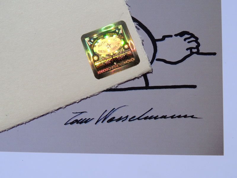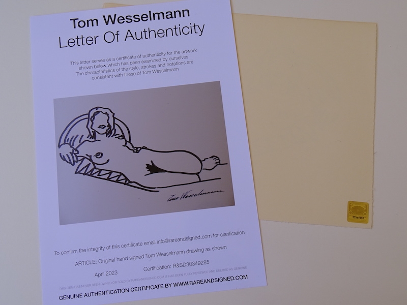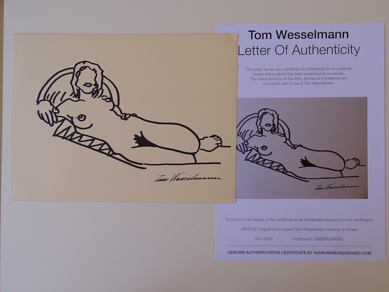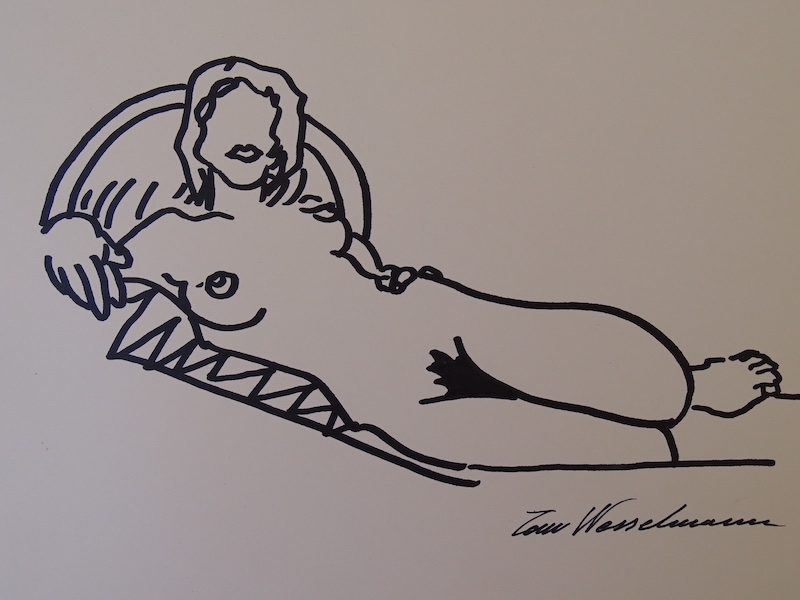 Tom Wesselmann, attribute, nude. From 1949 to 1951 he attended college in Ohio; first at Hiram College, and then transferred to major in Psychology at the University of Cincinnati. He was drafted into the US Army in 1952, but spent his service years stateside. During that time he made his first cartoons, and became interested in pursuing a career in cartooning. After his discharge he completed his psychology degree in 1954, whereupon he began to study drawing at the Art Academy of Cincinnati. He achieved some initial success when he sold his first cartoon strips to the magazines 1000 Jokes and True. Cooper Union accepted him in 1956, and he continued his studies in New York. During a visit to the MoMA he was inspired by the Robert Motherwell painting Elegy to the Spanish Republic: The first aesthetic experience He felt a sensation of high visceral excitement in his stomach, and it seemed as though his eyes and stomach were directly connected. Wesselmann also admired the work of Willem de Kooning, but he soon rejected action painting: He realized he had to find his own passion he felt he had to deny to himself all that he loved in de Kooning, and go in as opposite a direction as possible." For Wesselmann, 1958 was a pivotal year. A landscape painting trip to Cooper Union's Green Camp in rural New Jersey, brought him to the realization that he could pursue painting, rather than cartooning, as a career