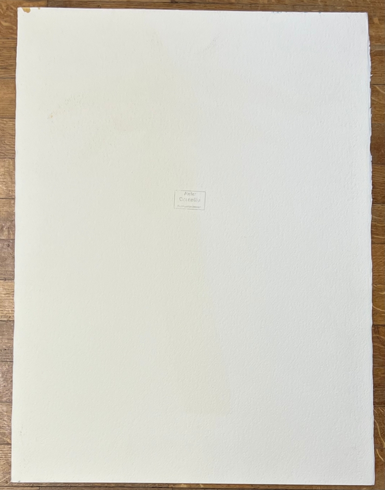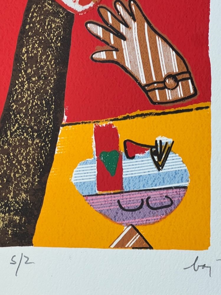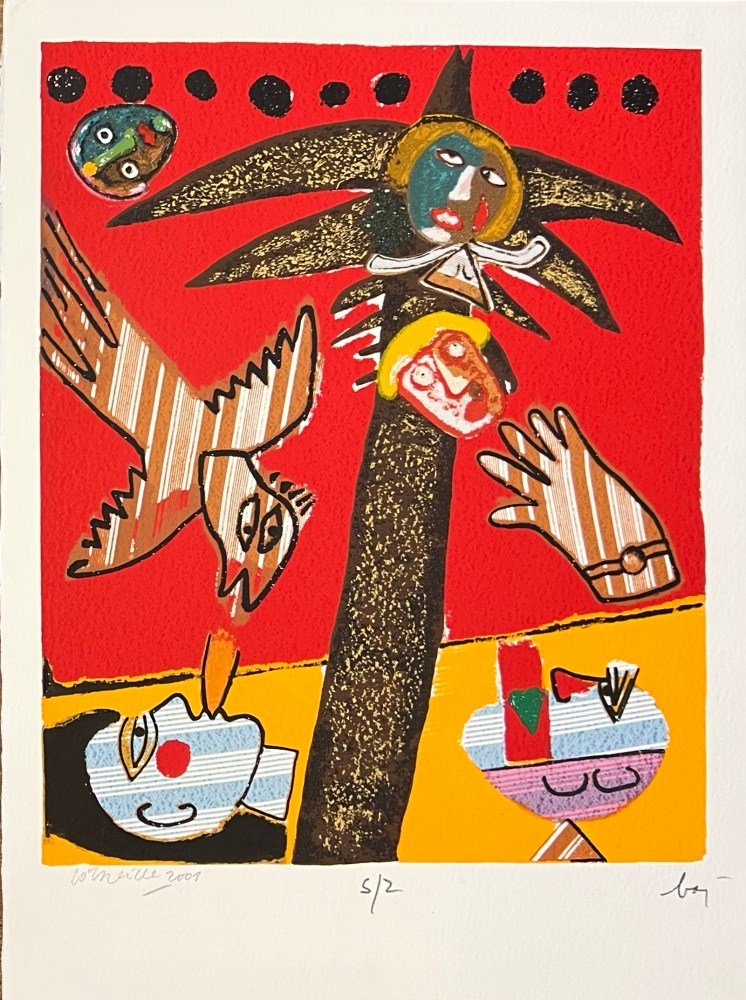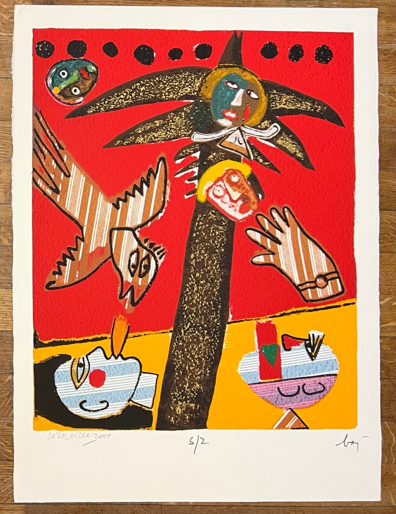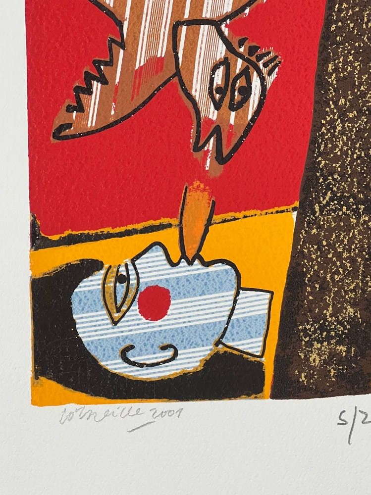 Beautiful four-handed work by painter Guillaume Corneille (1922-2010), and Enrico Baj (1924-2003), in very large format, entitled "L'heure du matelas". Mixed media with various types of sand applied to the surface, including a sand with crystals that gives relief and a glittering appearance. The image is a silkscreen print on thick rigid paper, edited in 100 copies and signed by both artists. S/Z copy with Atelier Corneille stamp on back Total dimensions: 76 x 57 cm Very good condition. Secure shipment by UPS
