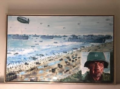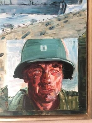 Painting with custom frame. The total size is 165cm x 105cm. Painted by Jerry Mangelschots. The painted scene is an image from the movie 'Saving Private Ryan' (The landing of Normandy) with Tom Hanks depicted. Painted in the year 2015. Unique item: normally no scenes from movies! Perfect in a modern interior or lovers of the WWII ( World War II ) or in a children's room. Auction prices fluctuate between 2500 - 4000 euros for this artist.