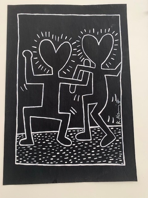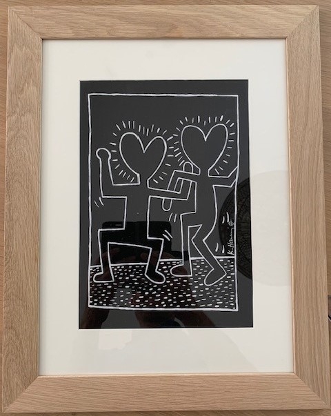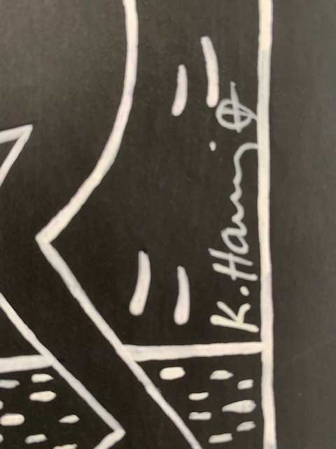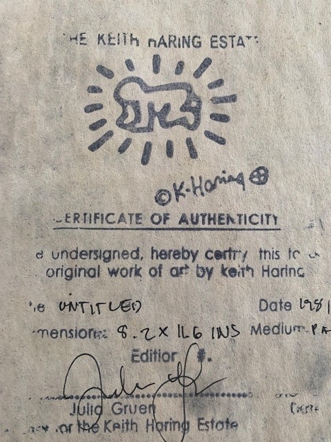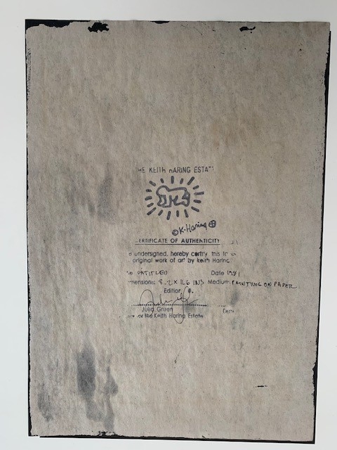 Unique work offered for sale by Keith Haring. The work is stamped on the back by the Keith Haring Estate and this stamp is hand signed by Julia Gruen. Julia Gruen is a trustee and vice president of the Keith Haring Foundation in New York. COA by the Keith Haring Foundation have not been issued for over a decade.