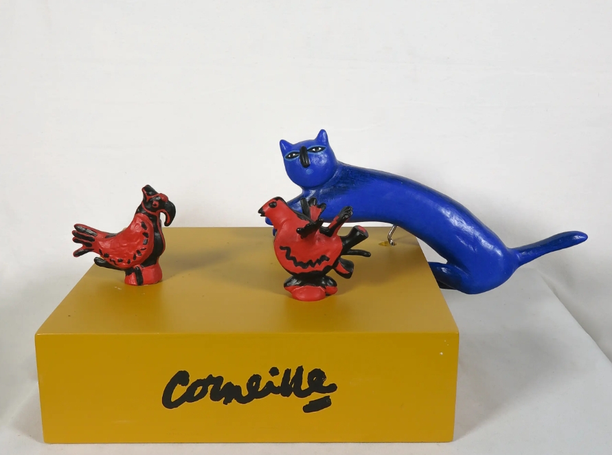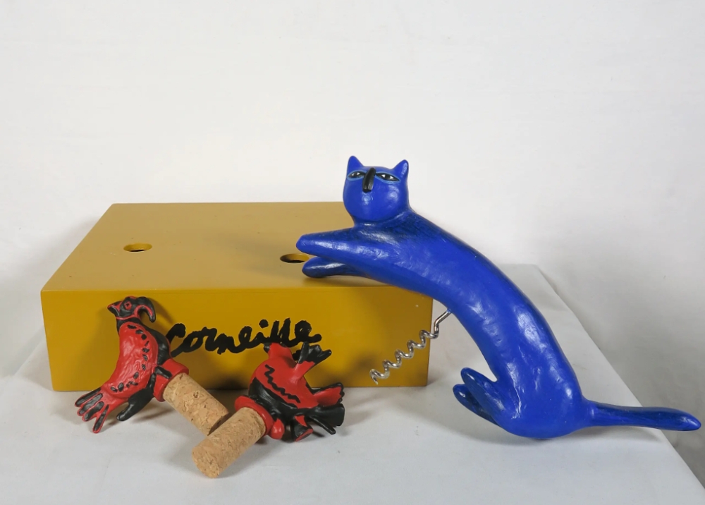 Multiple consisting of a numbered wooden box (295/999) with a corkscrew in the shape of a cat and two corks/stoppers with birds. The animal figures are made of resin. signature prints on front and back. numbered in marker on the back. Dimensions in arrangement with the animals on the box: 16 x 24 x 21 cm.