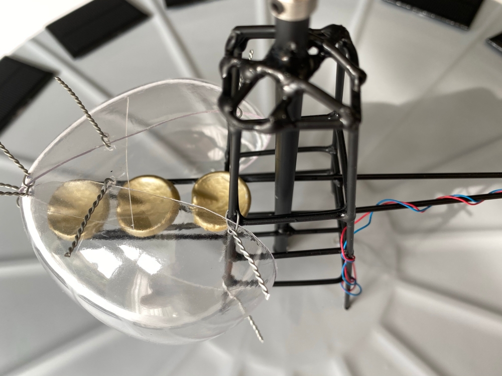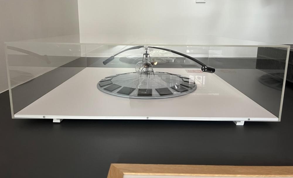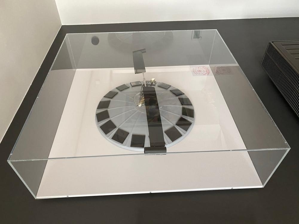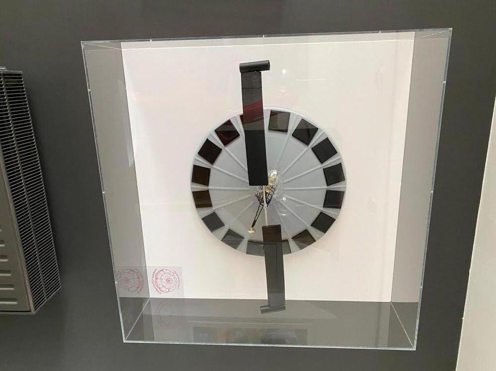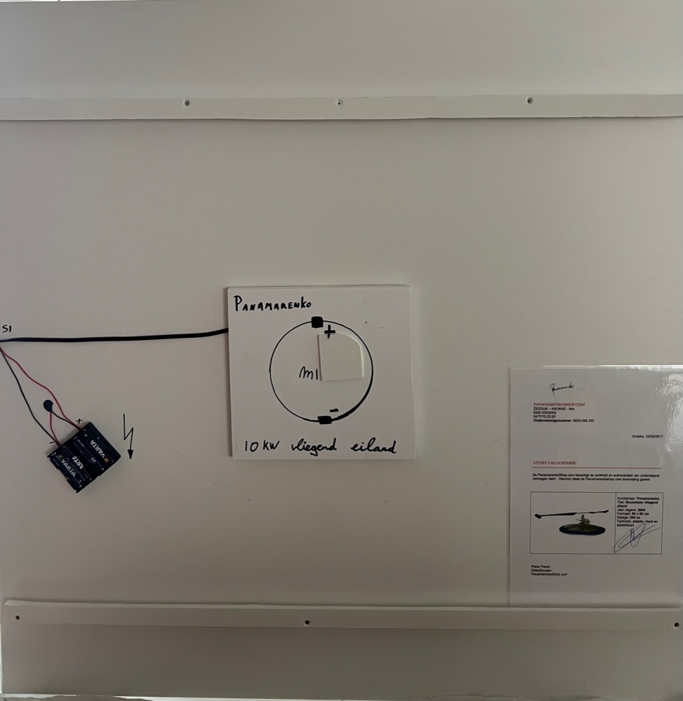 Working Panamarenko island mounted in a plexi box, beautiful eye-catcher. Video can be seen on YouTube, search with Panamarenko working island . This version is completed with working rotor and working propeller, driven by a motor, which means that the black wing and also the tail propeller in bronze can rotate. On and off with switch, works with AA batteries. Limited edition of 284 copies that were issued in 2004 by the Flemish Parliament during the Panamarenko exhibition. Certificate of building kit included with the work. Sturdy mounting in acrylic glass Mounted against the wall or presented standing.