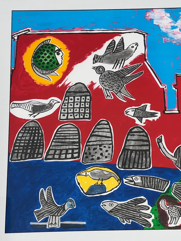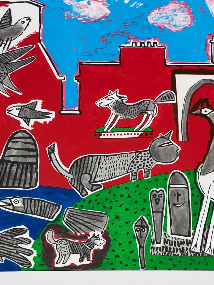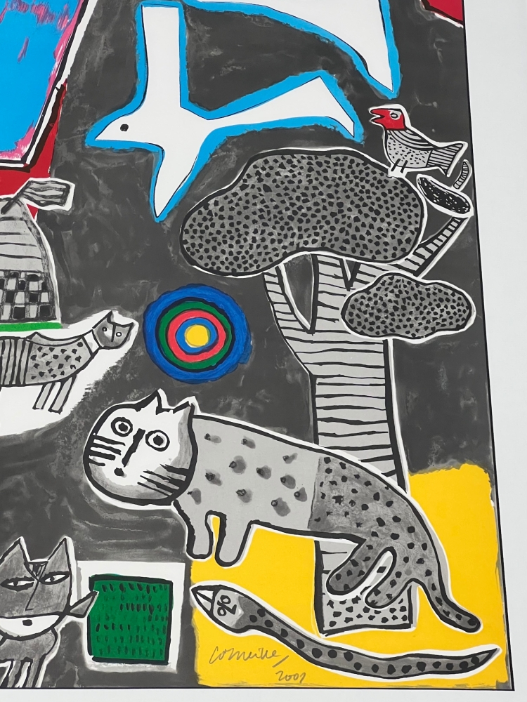 Rich and dazzling work with a nod to the Cobra movement by the snake above the signature, and where we find Corneille's familiar bestiary: cat, fish, birds and dog. Original lithograph by the painter Guillaume Corneille (1922-2010), born in Liège of Dutch parents and founding member of the Cobra group with Karel Appel, Asger Jorn, Constant, Dotremont and later Alechinsky and Jacques Doucet Signed and dated in pencil by the artist Artist's proof with Atelier Corneille stamp on the back. Total dimensions: 74 x 132 cm - Dimensions of the work : 56 x 115 cm. Very good condition. Frame cropped at corners. Some traces of wear on the frame.- Secure shipping with UPS Exhibition of 75 years of Cobra since June 1st at the Cobra Museum in Amstelveen. Opening of the Cobra depot in Antwerp. Release of a Cobra / Corneille stamp at Bpost in 2023 Identified as an important figure in the renewal of abstraction in Northern Europe, Corneille gradually moved from 1967 towards a rich and colorful New Figuration that coordinated with the Pop Art taste of the 1960s and 1970s, and exhibited alongside Andy Warhol, Arman, César, etc.