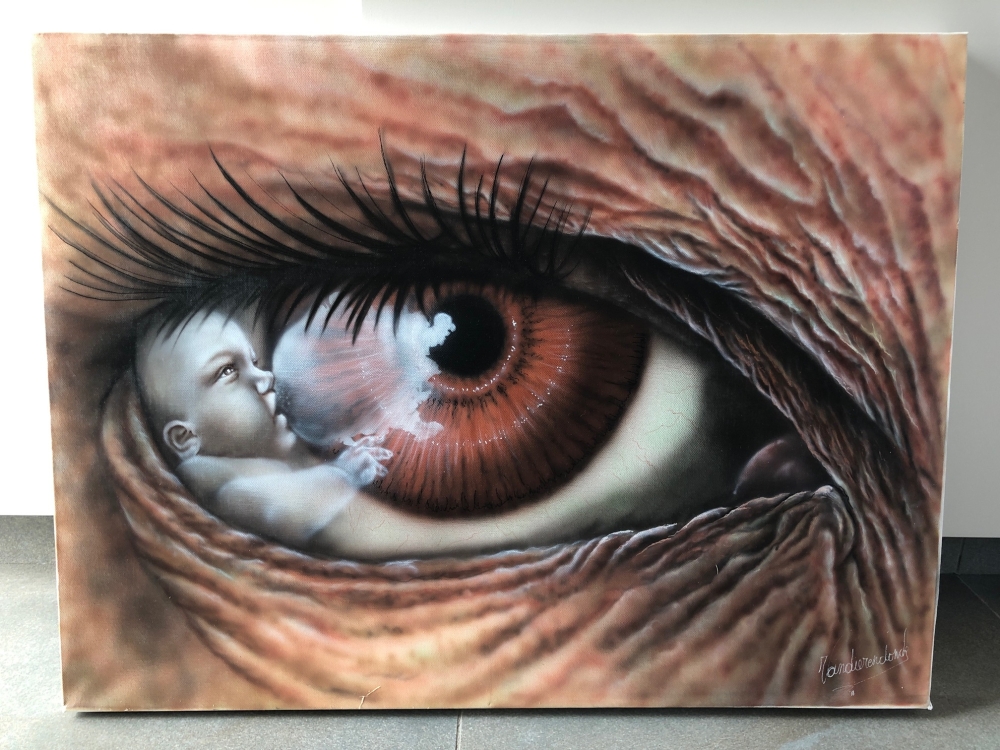 "The painting 'Eye with baby' by Ronny Van Dierendonck shows a fascinating and surrealistic scene in which the viewer is confronted with an intriguing image. The baby in the eye can be seen as a metaphor for the continual cycle of life and the renewal of hope and expectation. It reminds the viewer that we were all innocent and uninhibited before life formed us.