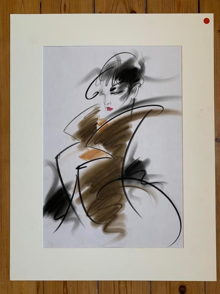 Large oil pastel on paper. Dimensions: 49 x 34 cm and 65 x 50 with passe partout. To be framed. Signed and dated lower right by the artist. 1989 Around 1990, Henri Matchavariani made a whole series of fashion drawings with clothes inspired by Thierry Mugler. Henri Matchavariani (born 1939) is a French painter, calligrapher and illustrator of Georgian and Romanian descent. He was an art director in Paris and Milan. He created numerous illustrations for the press (Vogue) and advertising campaigns, notably for Air France. He worked closely with Helmut Newton on a project for Cacharel. His art is guided by the elegance of line and by an imaginative flight gesture, inspired by the East. His calligraphy corresponds to that of Christian Dotremont. An exhibition "Henri Matchavariani and Christian Dotremont" is planned soon. "Just a few strokes, by thrift, by strict necessity for the sign. Just a few strokes like a vibration of pastel or ink in the silence of my white sheets. Just a few strokes, and no more than that". Henri Matchavariani Henri Matchavariani is also a personality of French cinema: he has realised numerous dubbings, and appears regularly in second roles, notably in films by Philippe Claudel, Roman Polanski, etc. He is currently handing Michael Douglas the title role of the Apple TV series : Benjamin Franklin.