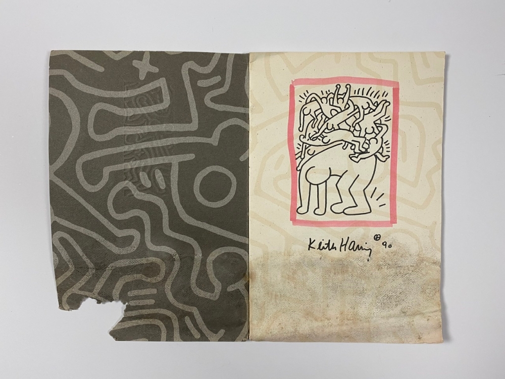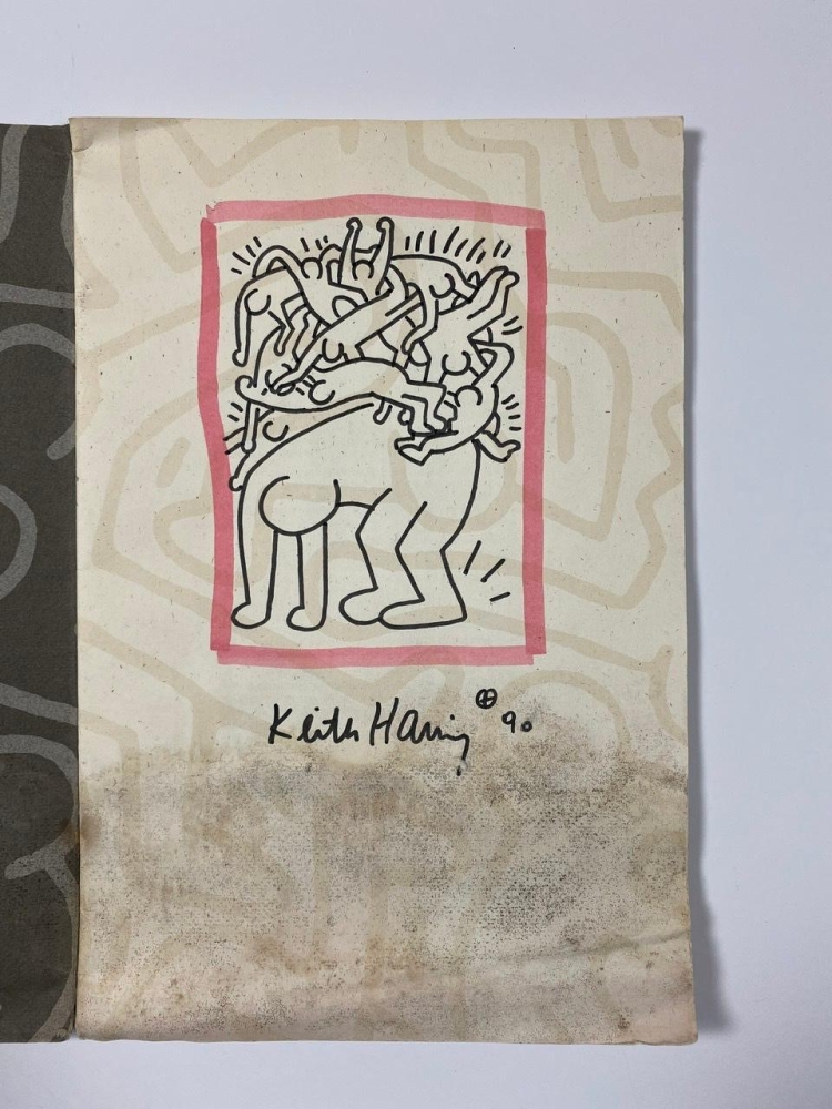 Original drawing by Keith Haring from 1990. Keith Haring made this drawing shortly before his death, the figuration is known from the very last edition that was issued entitled 'Fight Aids Worldwide'. This copy is an original drawing by the artist of this well-known figuration in an old catalogue. The catalog has water damage at the bottom, but the drawing is still completely intact. Collection or shipping possible.