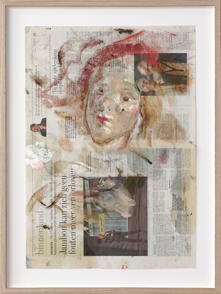 Monotype on newspaper (framed) Printed by Matthieu Ronsse in Machelen aan de Leie Edition of 1 Published in March 2021 Matthieu Ronsse painted an entire room of the Raveel Museum in Machelen aan de Leie, in late 2019. His work embraced the entire space, door and fireplace included. After the exhibition, the work would disappear in fact, that was a condition for participating. However, his murals made such an impression that the museum decided to keep them. While painting the room in the Raveel Museum, Matthieu Ronsse made a series of monotypes by placing sheets of newspaper on the newly painted, wet walls and thus transferring part of the image to paper. In this way he ensured that the work, originally ephemeral in nature, would still leave its mark. He used the newspaper of the day on which he made the prints, thus anchoring a series of images in time. He did this in 12 unique pieces (unique prints or monotypes). At a later stage, Ronsse applied further touches of paint to these prints and some of the sheets were even used by the artist to mix his paint. The result of this is 12 unique works, in which we recognize nods to Rembrandt, Cézanne, Velázquez and Lucian Freud.