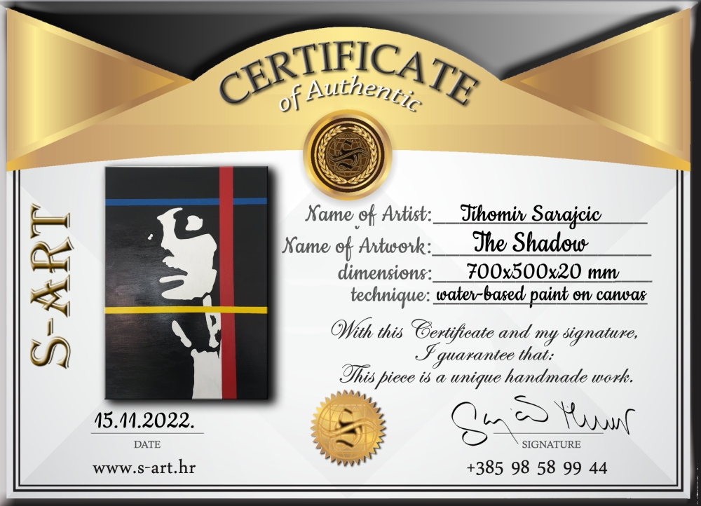 The Shadow/ water-based paint on canvas Outline of a beautiful female head bordered by three thick lines (blue, red and yellow, Mondrian theme) Item is ready to hang on the wall... One of a kind work Unique work, comes with a certificate of authenticity. IMPORTANT NOTE: SHIPPING TO THE EU ONLY - NO SHIPPING TO NON-EU COUNTRIES. Tihomir Sarajcic, Croatian artist, born in 1980. He creates sculptures by welding and forging metal, wire wall art, paints on canvas. All his works depict nature and the world close to him. He is the owner of the craft studio/workshop "S-art" for making metal sculptures. So far, he has had two exhibitions in his hometown and attends art fairs.