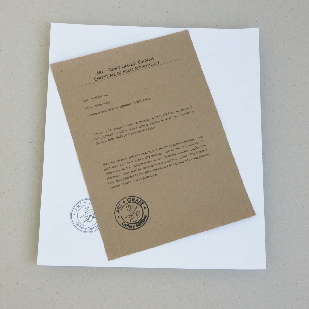 ● Philip Mckay est un artiste anglais, né en 1963. Son travail implique la photographie et l'art numérique. ● Il est influencé par des événements du passé et utilise le désespoir et la solitude comme base de son univers surréaliste et atmosphérique. Son art est pensif et onirique. Influencé par Dali et Magritte, il crée habilement des réalités nouvelles et inhabituelles. Ses images conceptuelles sont régulièrement publiées sous forme de couvertures d'albums de musique et représentées par des galeries d'art au Royaume-Uni et au-delà. ● Tirage chromogénique sur papier Fuji Crystal Archive ● Format papier - 14" x 12" (36 x 30 cm) ● Taille de l'image - 10½" x 10½" (26 x 26 cm) ● Signé dans la plaque ● Cachet de galerie numéroté ● Certificat d'authenticité d'impression ● Titre sous l'image ● État - Parfait ● Livré dans un grand tube en PVC
