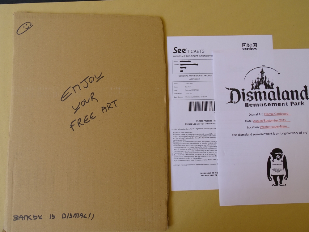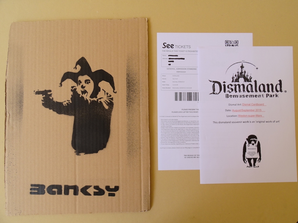 Banksy signed dismaland artwork. Good condition in general Material: cardboard Stencil spray paint from Banksy's theme park "Dismaland" held for two months from August to September 2015. Artist: BANKSY