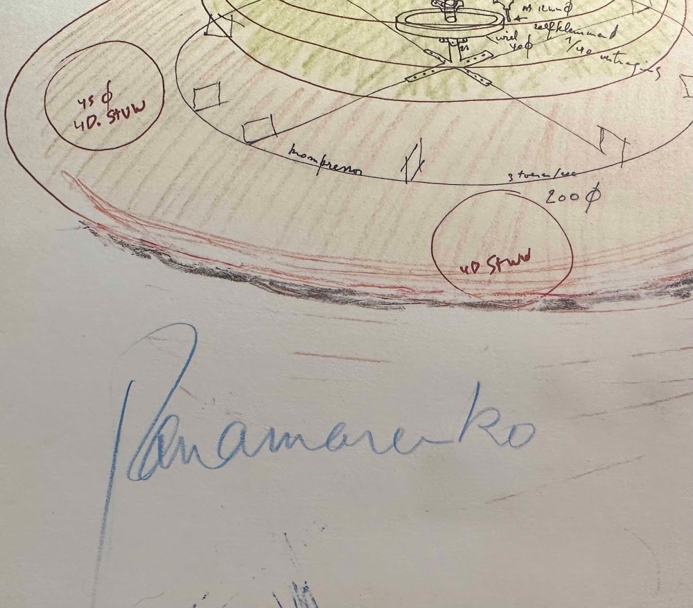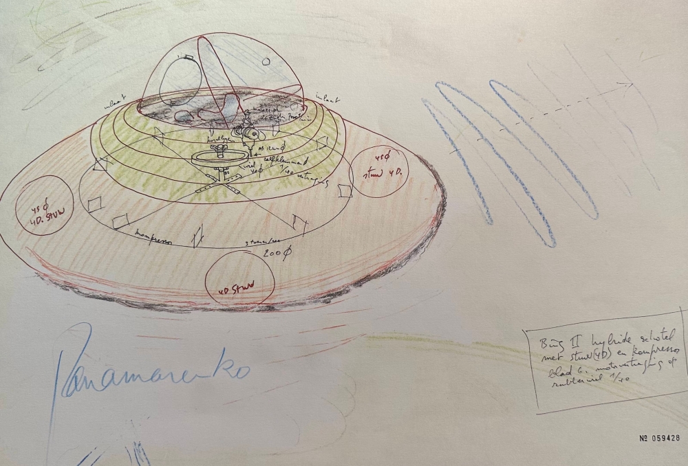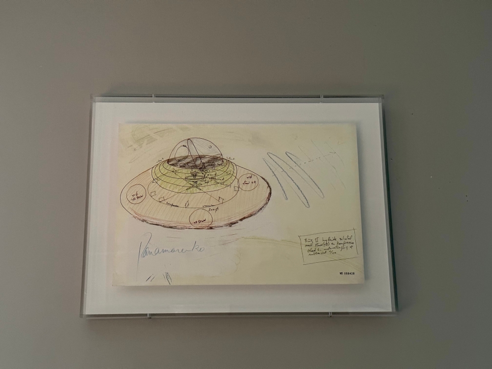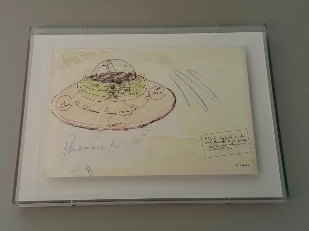Copie signée à la main (au crayon bleu) - très rare - de Bing II de Panamarenko. 99 % des exemplaires portent une signature argentée imprimée. Un certain nombre d'exemplaires furent imprimés pour Panamarenko sans signature, qu'il signa ensuite au crayon bleu pour un certain nombre d'intimes. Bel exemplaire unique. Encadré dans un nouveau cadre en plexi vierge. L'œuvre a été relevée dans le cadre.
