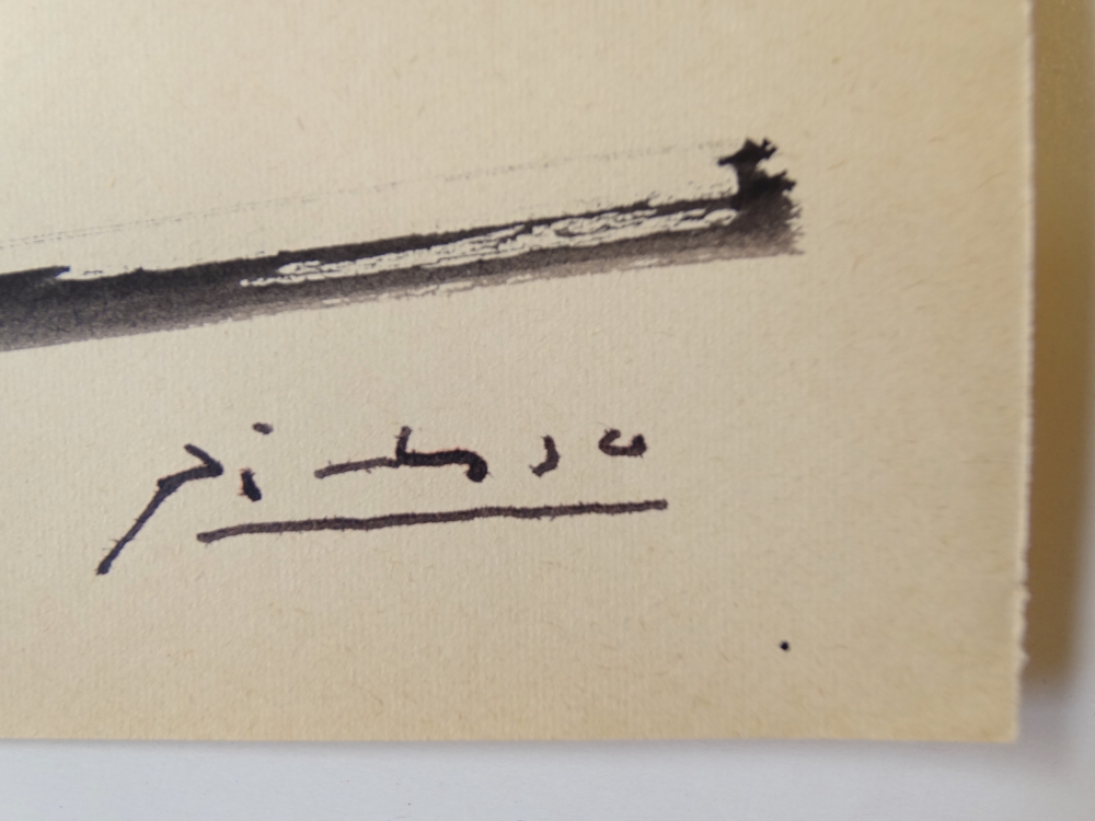 Dessin à l'encre de Pablo Picasso (attribué) Très bonne condition Lettre d'authenticité incluse. Considéré comme l'un des artistes les plus influents du XXe siècle, il est connu pour avoir cofondé le mouvement cubiste, l'invention de la sculpture construite, la co-invention du collage et pour la grande variété de styles qu'il a contribué à développer et à explorer. . Parmi ses œuvres les plus célèbres figurent le proto-cubiste Les Demoiselles d'Avignon (1907) et le tableau anti-guerre Guernica (1937), une représentation dramatique du bombardement de Guernica par les forces aériennes allemandes et italiennes pendant la guerre civile espagnole.