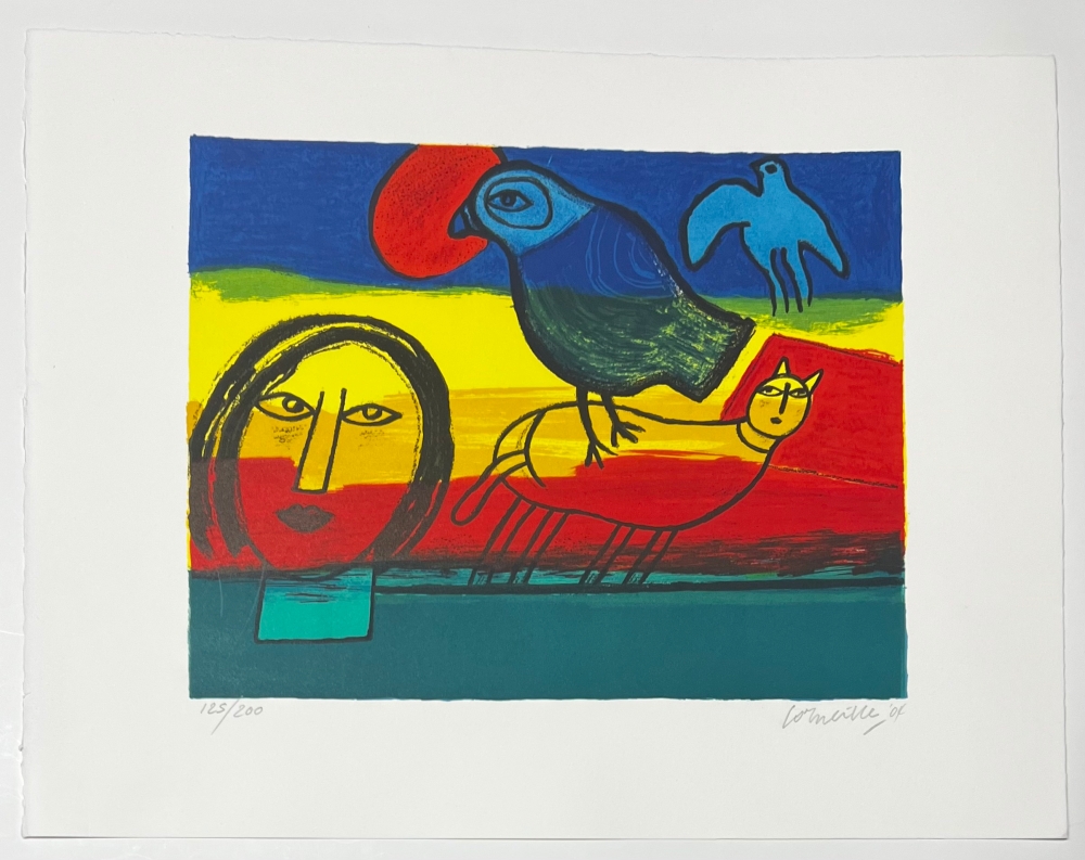 Grand maître de la couleur, dans le sillage de Gauguin et Matisse, Guillaume Corneille crée en 2004 une oeuvre associant le chat, les oiseaux, la femme Muse, et le soleil rougeoyant. La qualité des plaques lithographiques est telle qu'elle donne l'impression d'être face aux touches de pinceaux du peintre. Rêveries d'été apporte joie et onirisme dans un salon, une cuisine, ou une chambre. Le cadre de la dernière image est une suggestion de présentation, il n'est pas inclus dans l'annonce. Lithographie originale du peintre Guillaume Corneille (1922-2010), membre fondateur du mouvement Cobra. Signée et datée au crayon de la main de l'artiste Dimensions totales : 40 x 52 cm - 2004 - Numérotée 125/200 - Tampon Atelier Corneille au dos Image en parfait état - Coin inférieur gauche légèrement plié - Envoi sécurisé avec UPS Identifié comme une figure importante dans le renouvellement de l'abstraction en Europe du Nord, Corneille soriente progressivement à partir de 1967 vers une Nouvelle Figuration riche et colorée qui se coordonne avec le goût Pop Art des Années 1960 et 1970. Exposition des 75 ans de Cobra à partir du 1er Juin au Cobra Museum à Amstelveen. Ouverture du dépôt Cobra à Anvers en Juin 2023 Sortie d'un timbre Cobra / Corneille chez Bpost en 2023