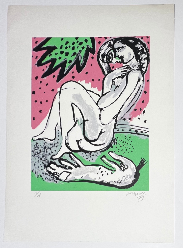 Rare et belle oeuvre signée, titrée et datée de la main de l'artiste. Exemplaire d'artiste E/A avec Tampon Atelier Corneille au dos. Référencée sous le numéro 400 du catalogue raisonné de l'art graphique du peintre par Donkersloot. Lithographie originale du peintre Guillaume Corneille (1922-2010), né à liège de parents néerlandais et membre fondateur du groupe Cobra avec Karel Appel, Asger Jorn, Constant, Dotremont et par la suite Alechinsky et Jacques Doucet Dimensions totales : 69,5 x 50 cm - Très bon état avec légers froissements sur le papier - Envoi sécurisé avec UPS Exposition des 75 ans de Cobra à partir du 1er Juin au Cobra Museum à Amstelveen. Ouverture du dépôt Cobra à Anvers en Juin 2023 Sortie d'un timbre Cobra / Corneille chez Bpost en 2023