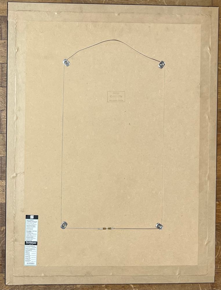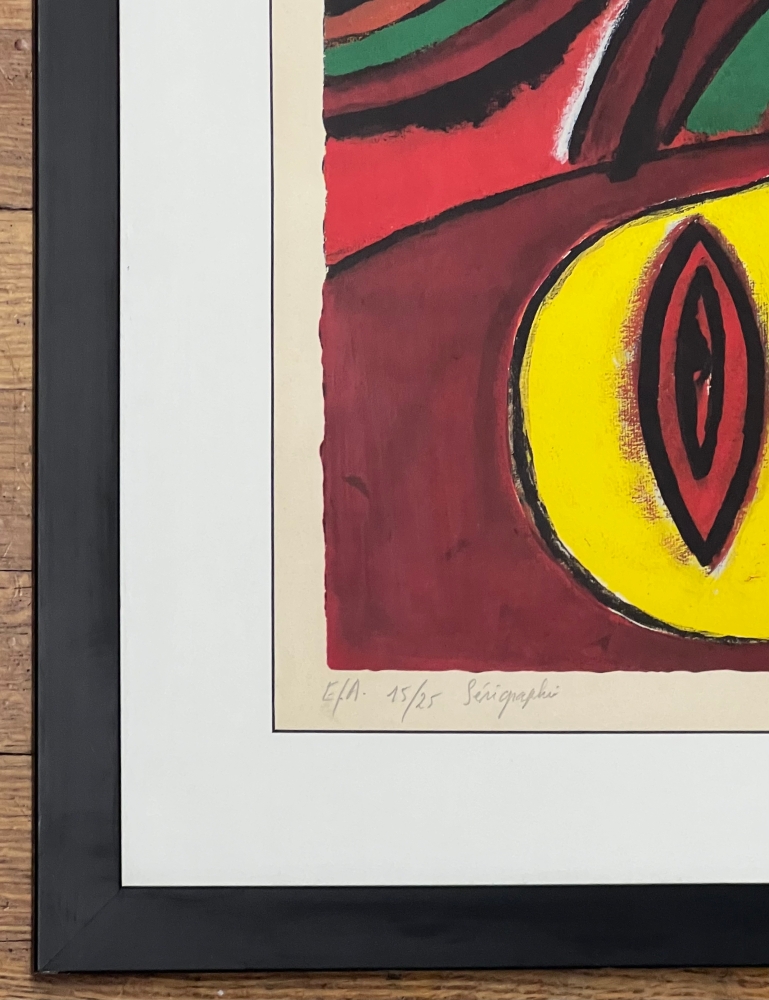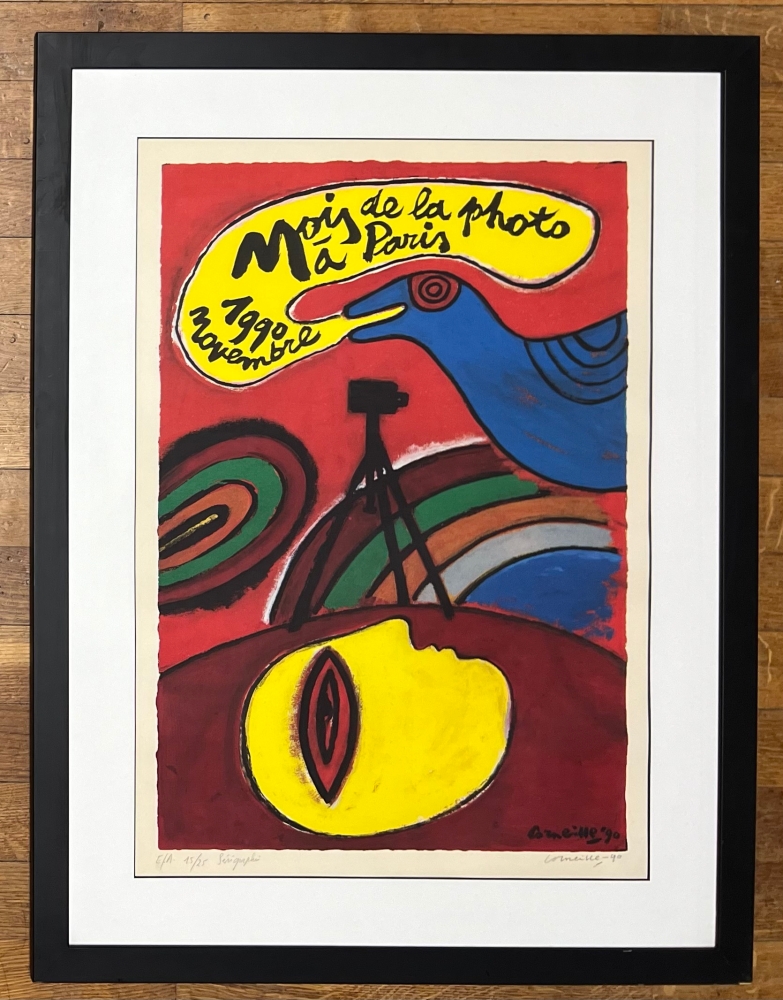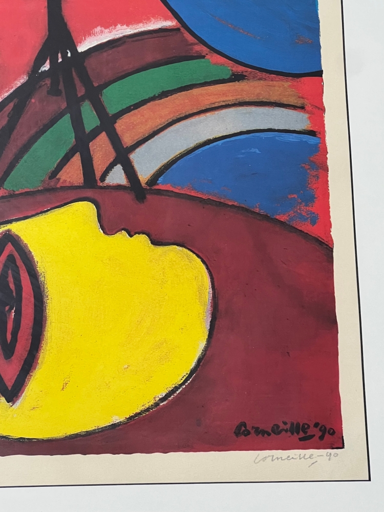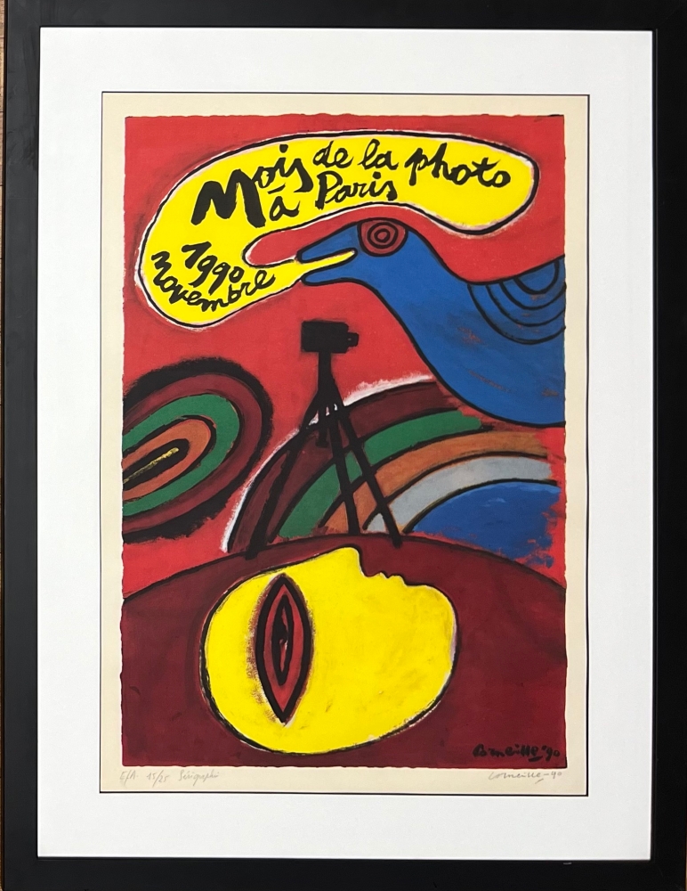 Novembre est le Mois de la photo à Paris! Dans le sillage de Matisse et Gauguin, Corneille crée un monde jovial et coloré. Ici il représente un oiseau chantant devant un horizon fait d'arcs en ciel. Sérigraphie originale du peintre Guillaume Corneille, né à Liège de parents Néerlandais, membre fondateur du groupe Cobra. Oeuvre signée dans la planche et signée et datée au graphite de la main de l'artiste en bas à droite Exemplaire d'artiste EA 15/25 avec Tampon Atelier Corneille au dos Dimensiosn avec cadre : 78 x 60 cm. Dimensions à l'intérieur du passe-partout : 61 x 42 cm. Envoi sécurisé avec assurances par UPS