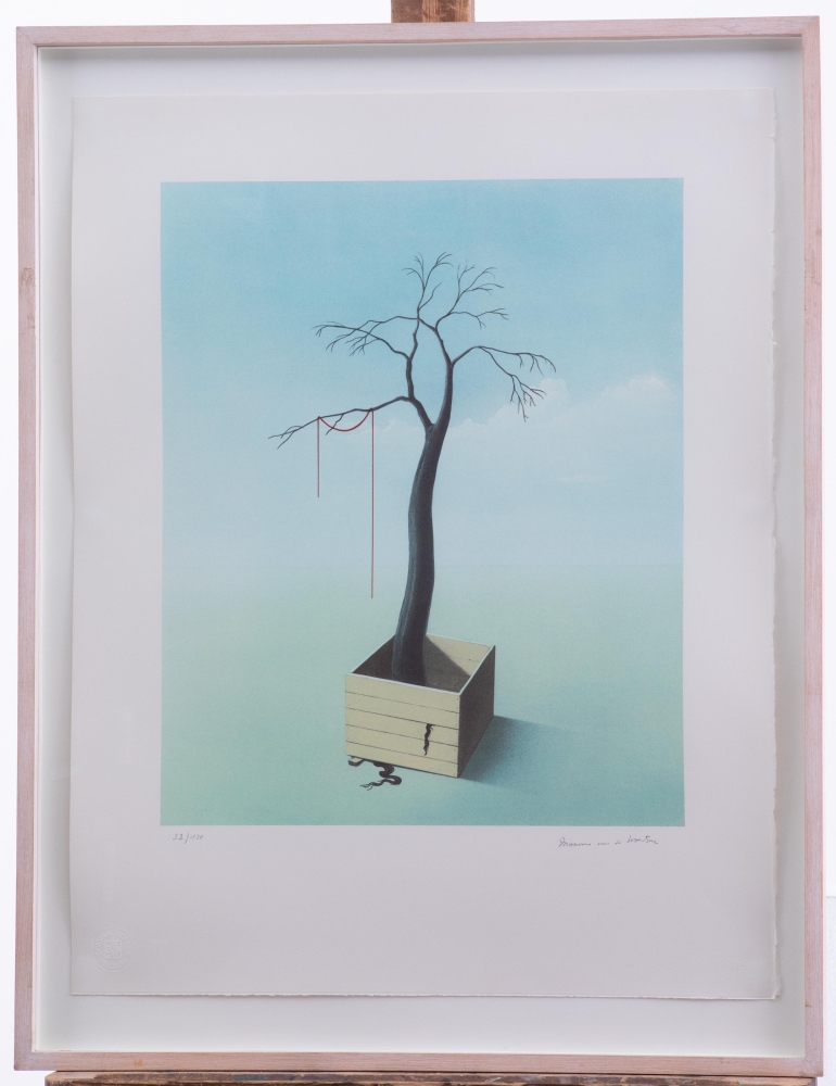 Sans titre. Lithographie en couleurs. Signée au crayon 'Maxime Van De Woestijne' et numérotée 32/150. Sur papier avec cachet sec 'Sérigraphie originale Belgique'. Dans le cadre. Dimensions : 540 x 440 cm (880 x 685 cm) Maxime Van de Woestyne était le descendant d'une importante famille d'artistes. Son père Gustave Van de Woestyne était un artiste important de la première école de Latem, qui a porté les arts visuels flamands au plus haut niveau international au tournant du siècle dernier. Son frère, le romancier et poète Karel Van de Woestyne, était l'un des rédacteurs de la revue littéraire faisant autorité Van Nu en Straks, la réponse flamande aux Pays-Bas des années quatre-vingt. Maxime Van de Woestyne est tombé dans sa jeunesse sous le charme de la peinture surréaliste, qui eut en Belgique un représentant de renommée mondiale avec René Magritte. Le surréalisme aspire à une représentation réaliste d'un monde irréel. Outre les images de rêve et les scènes cauchemardesques, les peintres surréalistes ont également réfléchi à la relation entre la réalité représentée et la réalité. L'exemple le plus connu est La Trahison des Images de Magritte, plus connu sous le titre Ceci n'est pas une pipe.