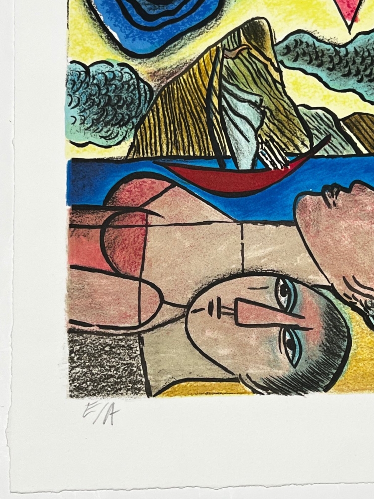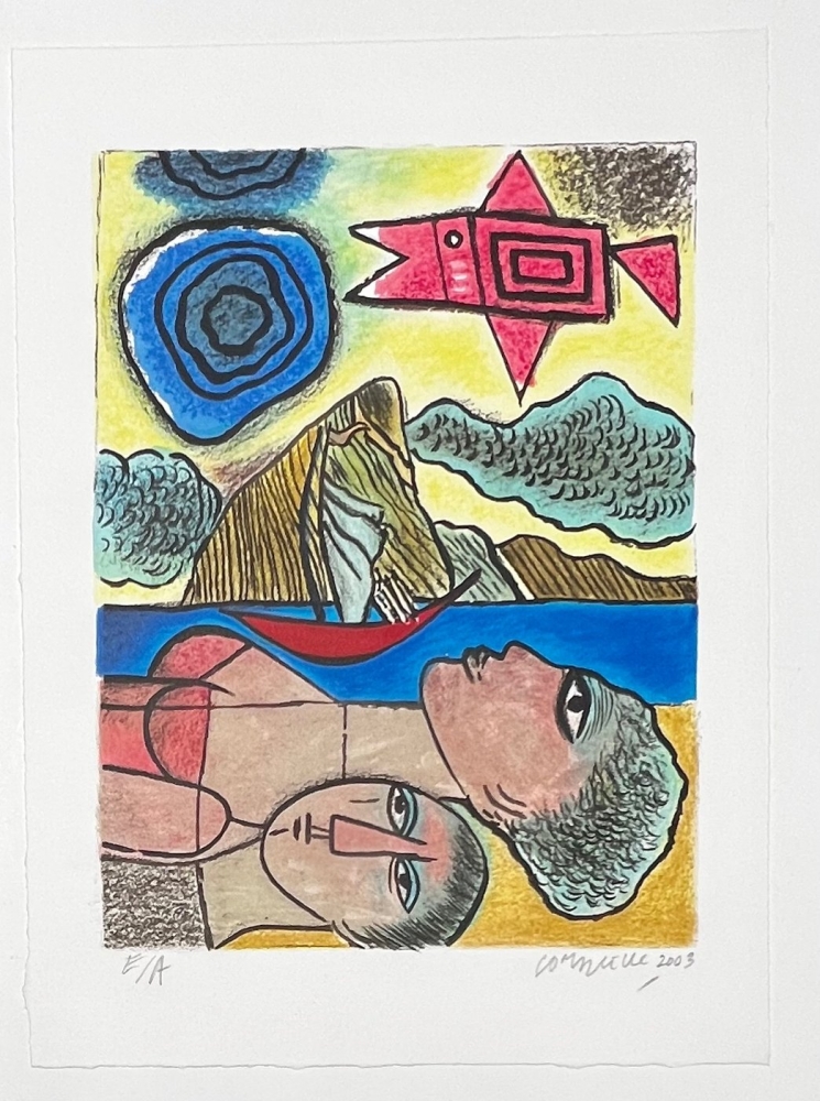 Chaque oeuvre de Guillaume Corneille est une invitation au voyage. La qualité des plaques lithographiques est telle qu'elle donne l'impression d'être face aux touches de pinceaux du peintre. Lithographie originale du peintre Guillaume Corneille (1922-2010), membre fondateur du mouvement Cobra. Signée et datée au crayon de la main de l'artiste Dimensions totales : 41 x 30 cm - 2003 - Exemplaire d'artiste E/A - Tampon Atelier Corneille au dos Image en parfait état- Envoi sécurisé avec UPS Identifié comme une figure importante dans le renouvellement de l'abstraction en Europe du Nord, Corneille soriente progressivement à partir de 1967 vers une Nouvelle Figuration riche et colorée qui se coordonne avec le goût Pop Art des Années 1960 et 1970.