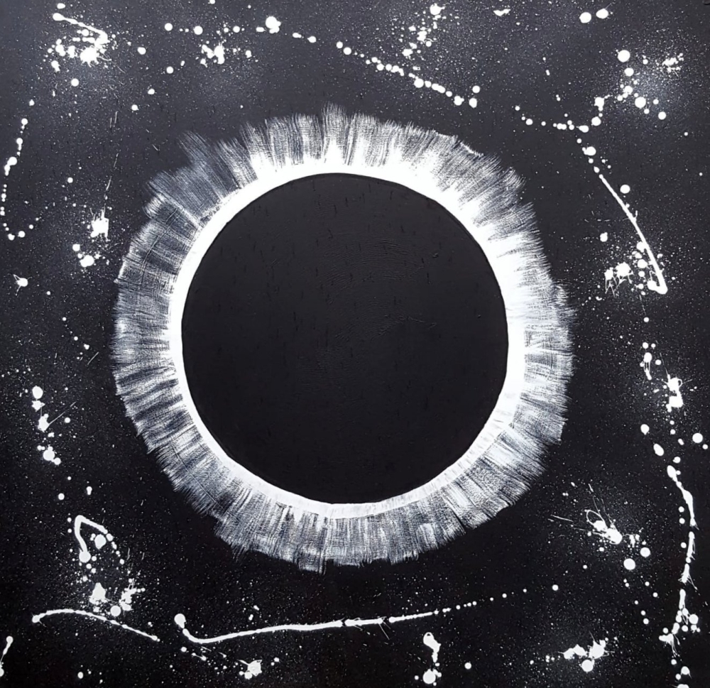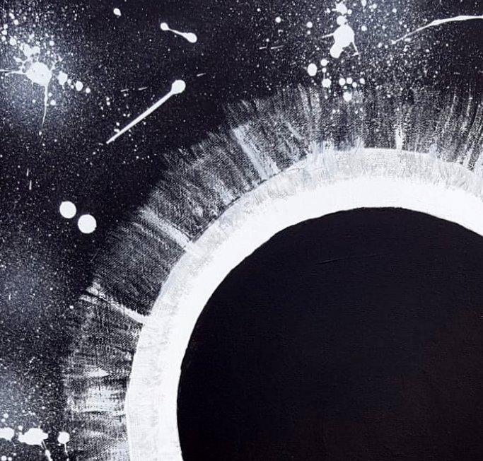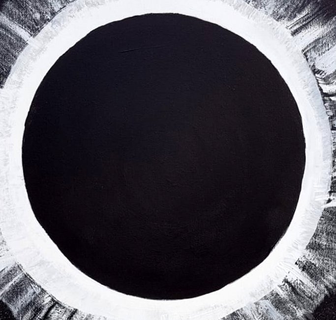 A.M.G. , een mooie maat BLACK HOLE SUN, ; DIT ACRYL WERK heeft een zeer aantrekkende uitstraling , eenmaal gevangen , dan blijft je nieuwsgierigheid aan je trekken , dus voor spanning moet je dit werk aan de wand hebben